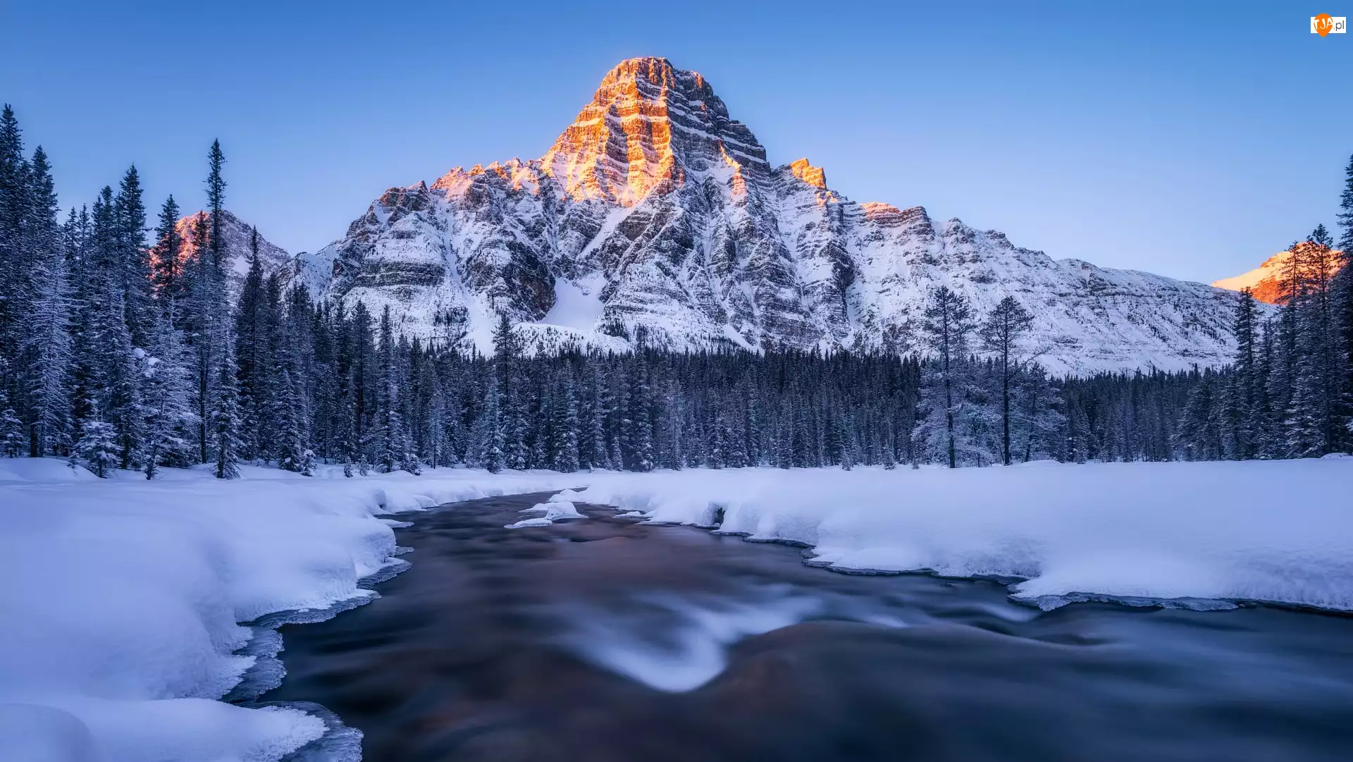 Rzeka, Zima, Mount Chephren, Park Narodowy Banff, Góry, Drzewa, Kanada, Góra