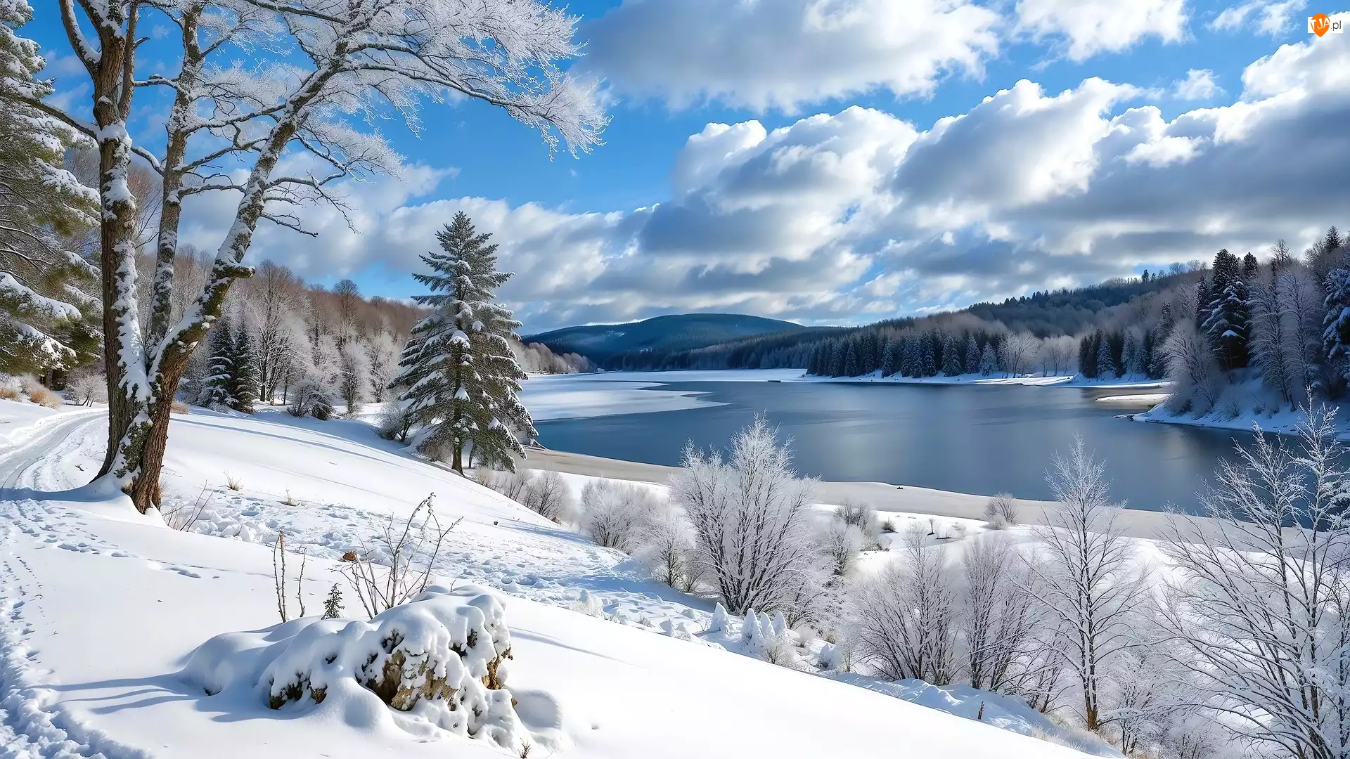 Rzeka, Zima, Śnieg, Grafika, Drzewa, Droga