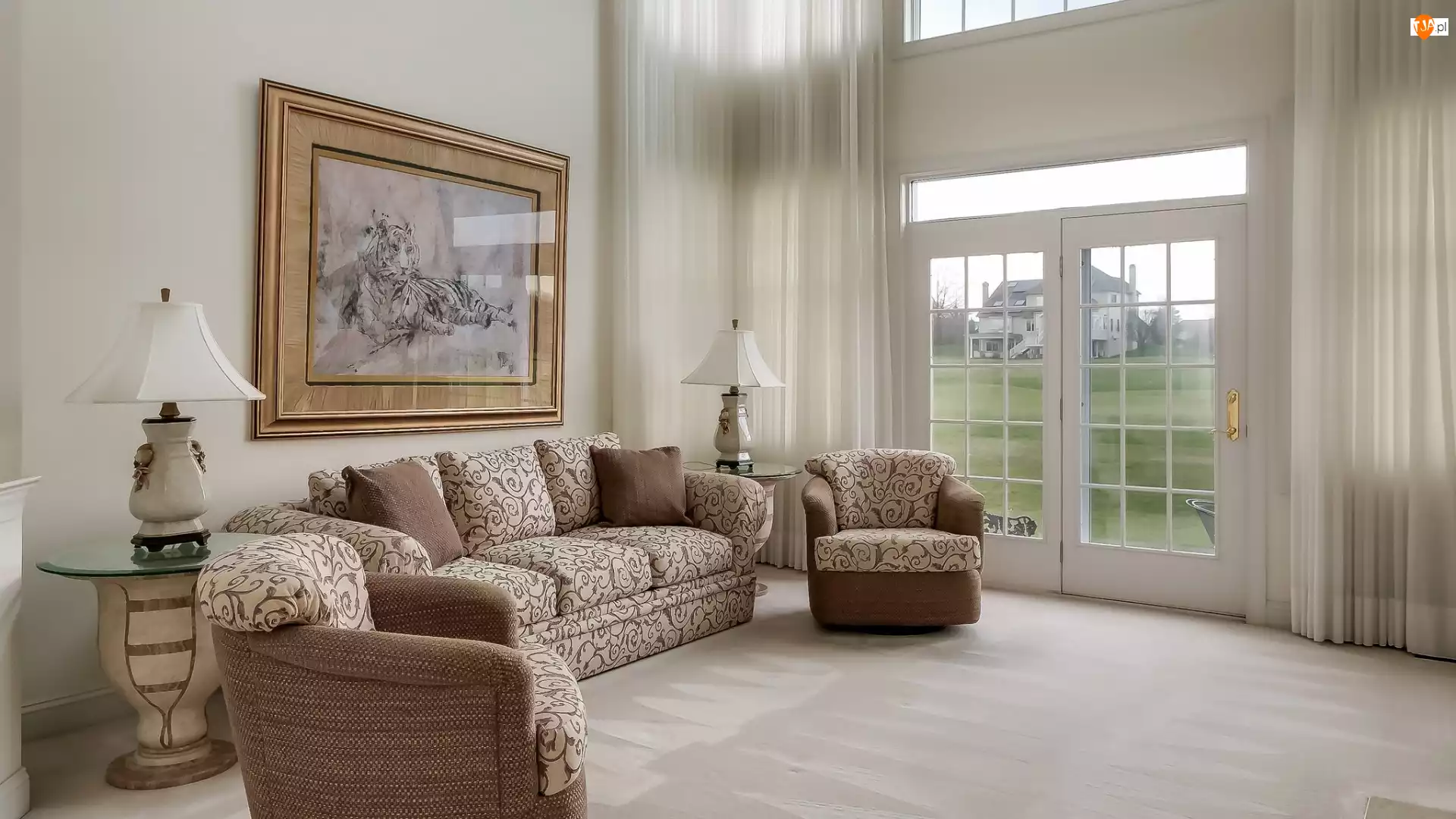 Okno, Kanapa, Lampy, Zasłony, Obraz, Fotele, Salon