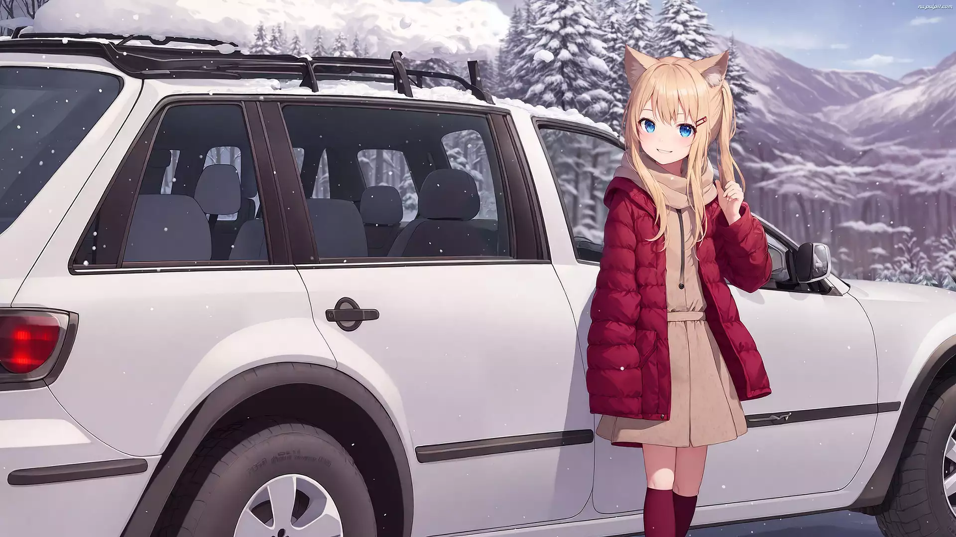 Samochód, Anime, Uszy, Dziewczyna, Zima