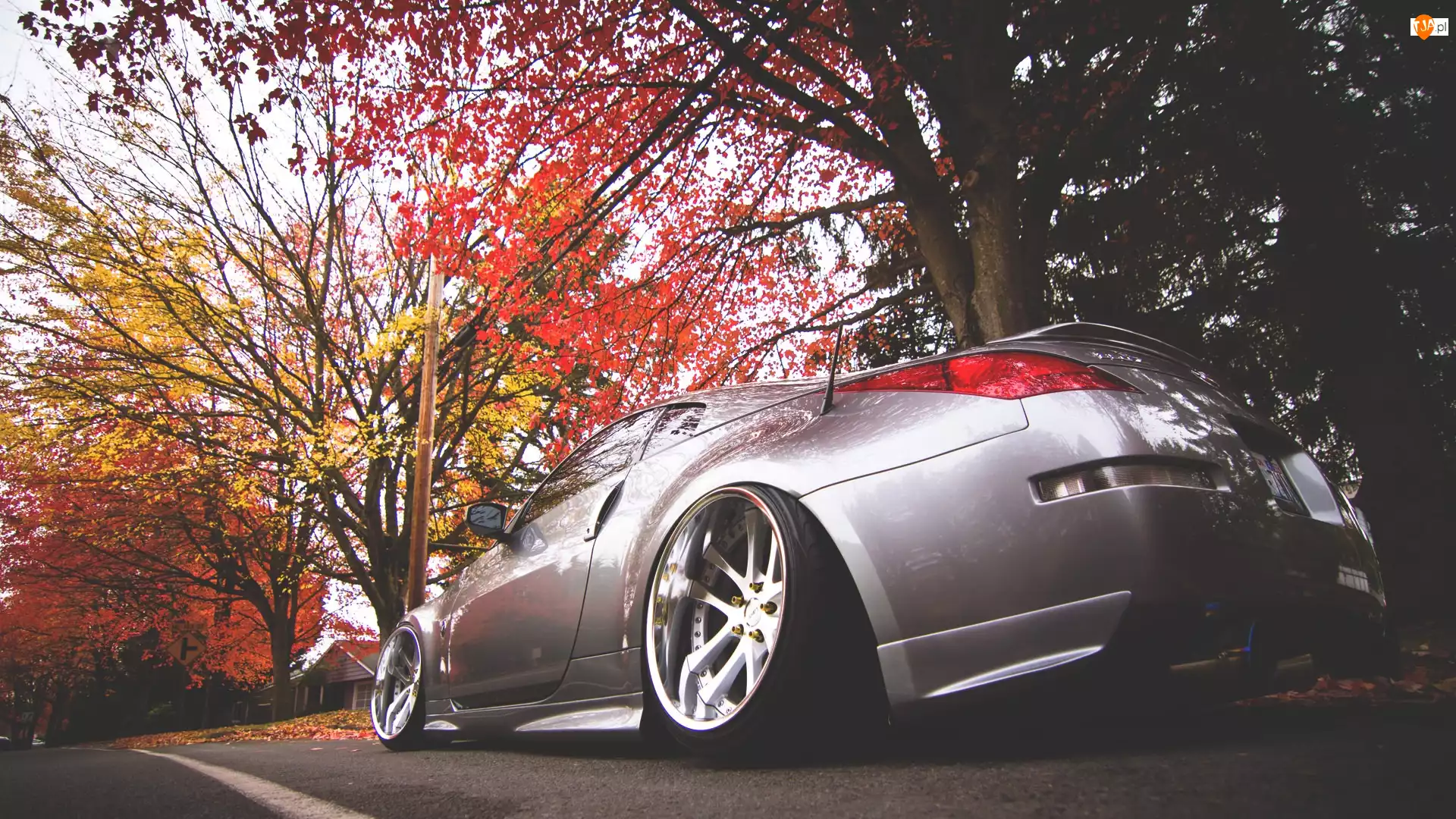 Samochód, Nissan, Drzewa, Srebrny, Droga, Jesień, 350Z