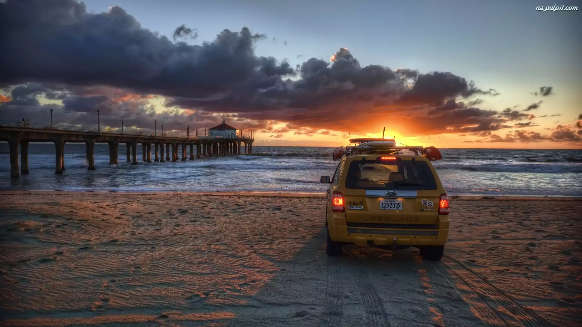 Chmury, Ford Escape Hybrid, Molo, Plaża, Zachód słońca