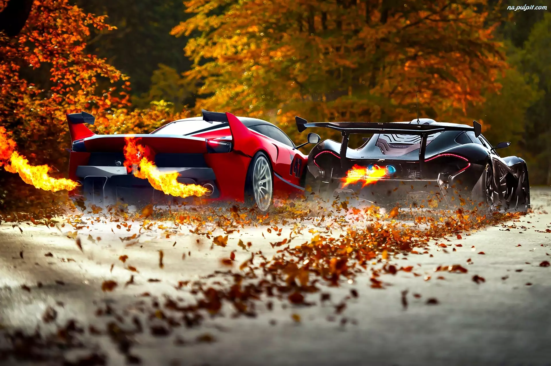 Samochody, Liście, Jesień, Drzewa, Droga, Ogień