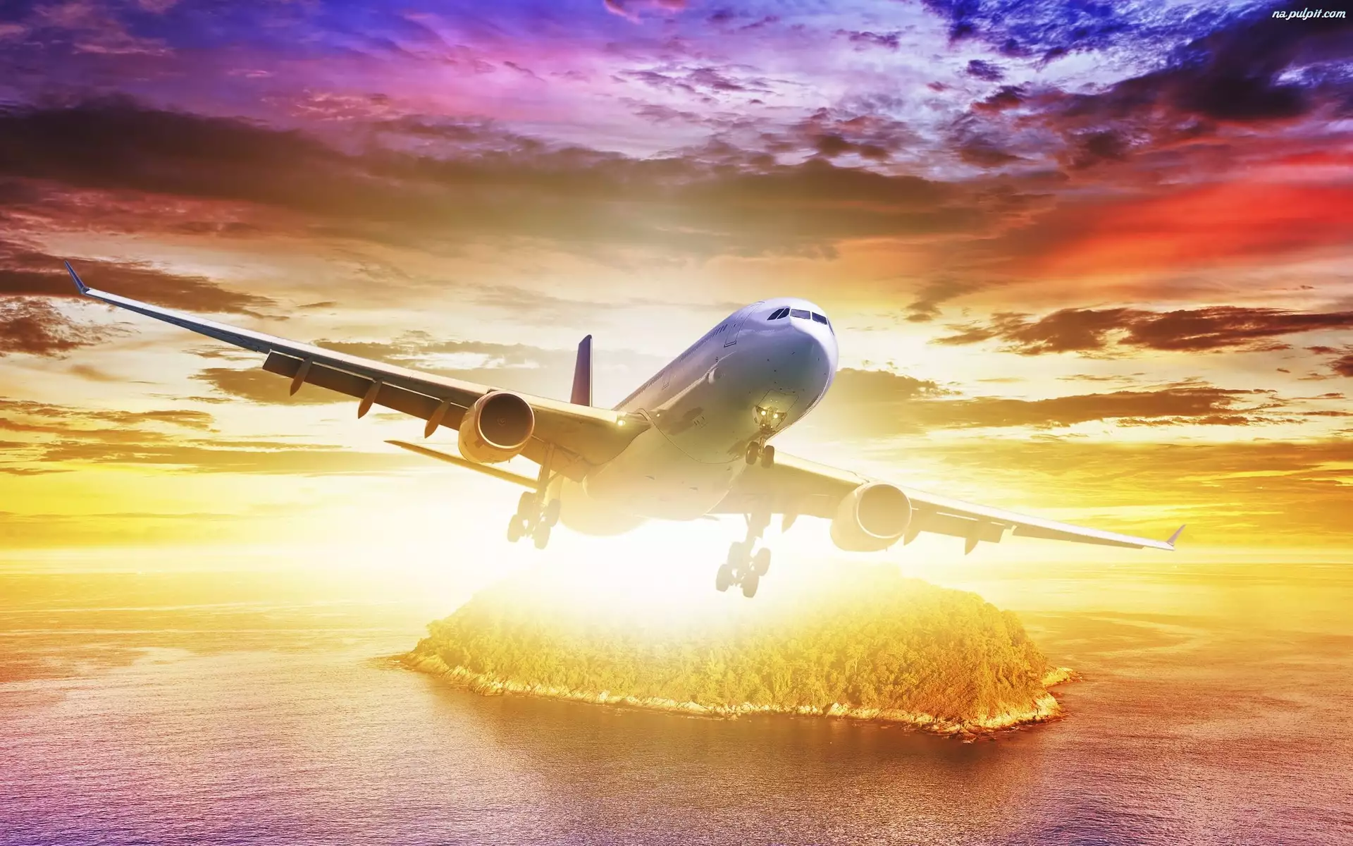 Samolot, Zachód, Wyspa, Słońca, Morze