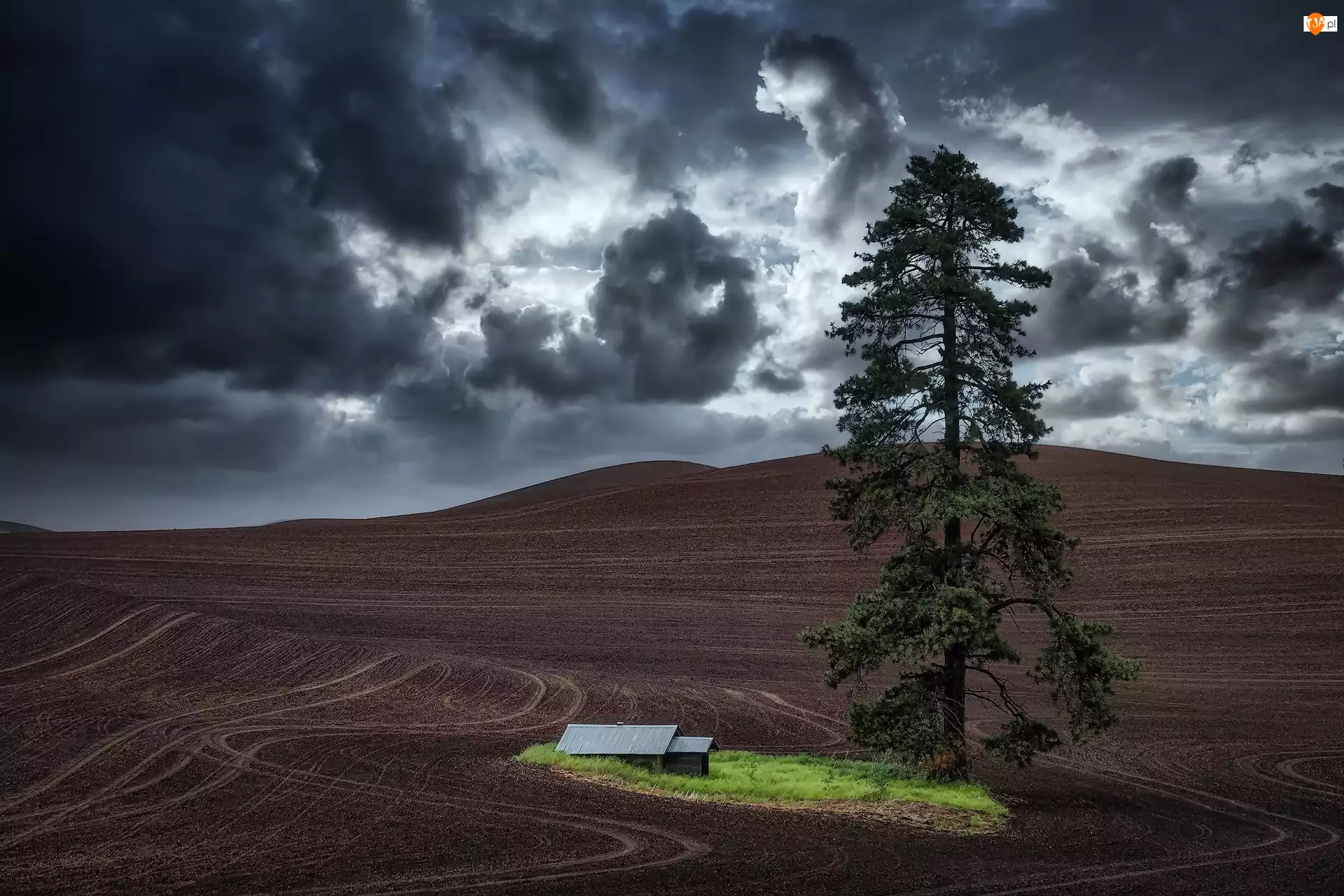 Stany Zjednoczone, Budynek, Region Palouse, Sosna, Chmury, Ciemne, Ślady, Pola, Drzewo, Stan Waszyngton