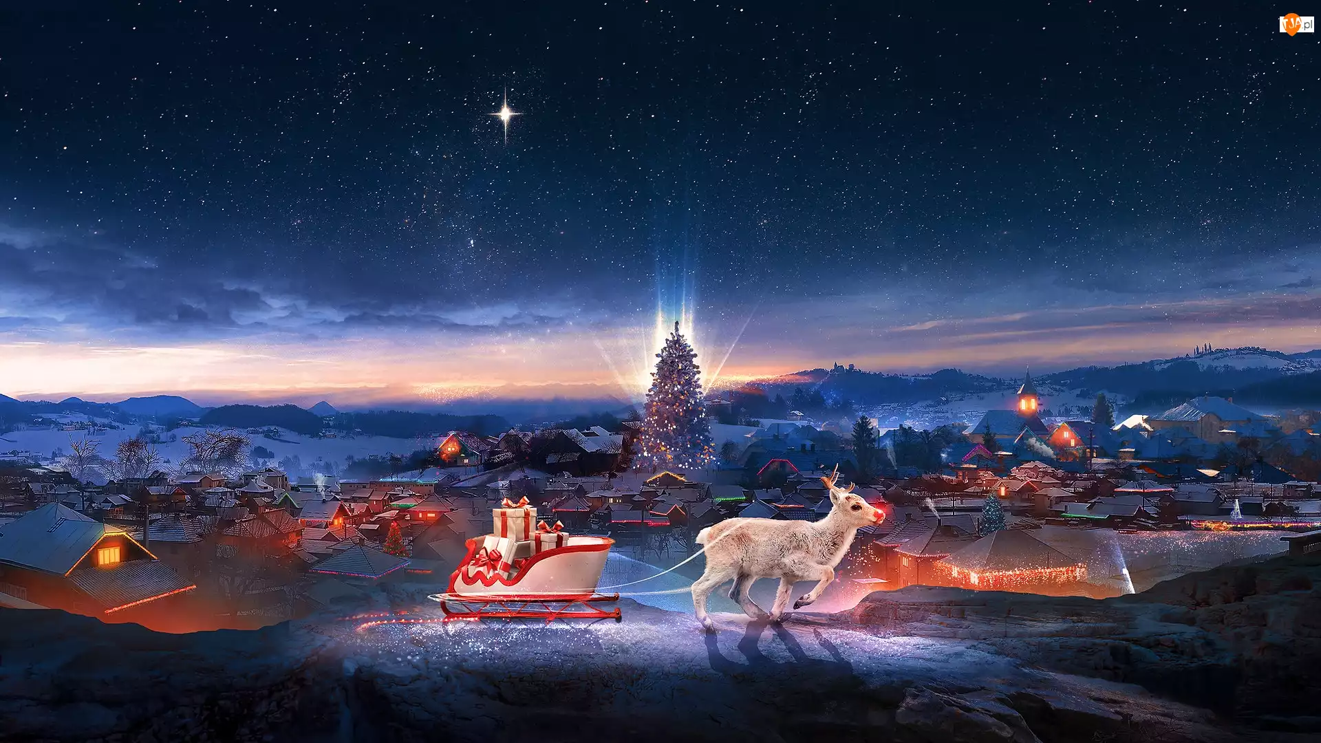 Gwiazdy, Grafika, Mikołaj, Domy, Boże Narodzenie, Prezenty, Renifer, Zaprzęg