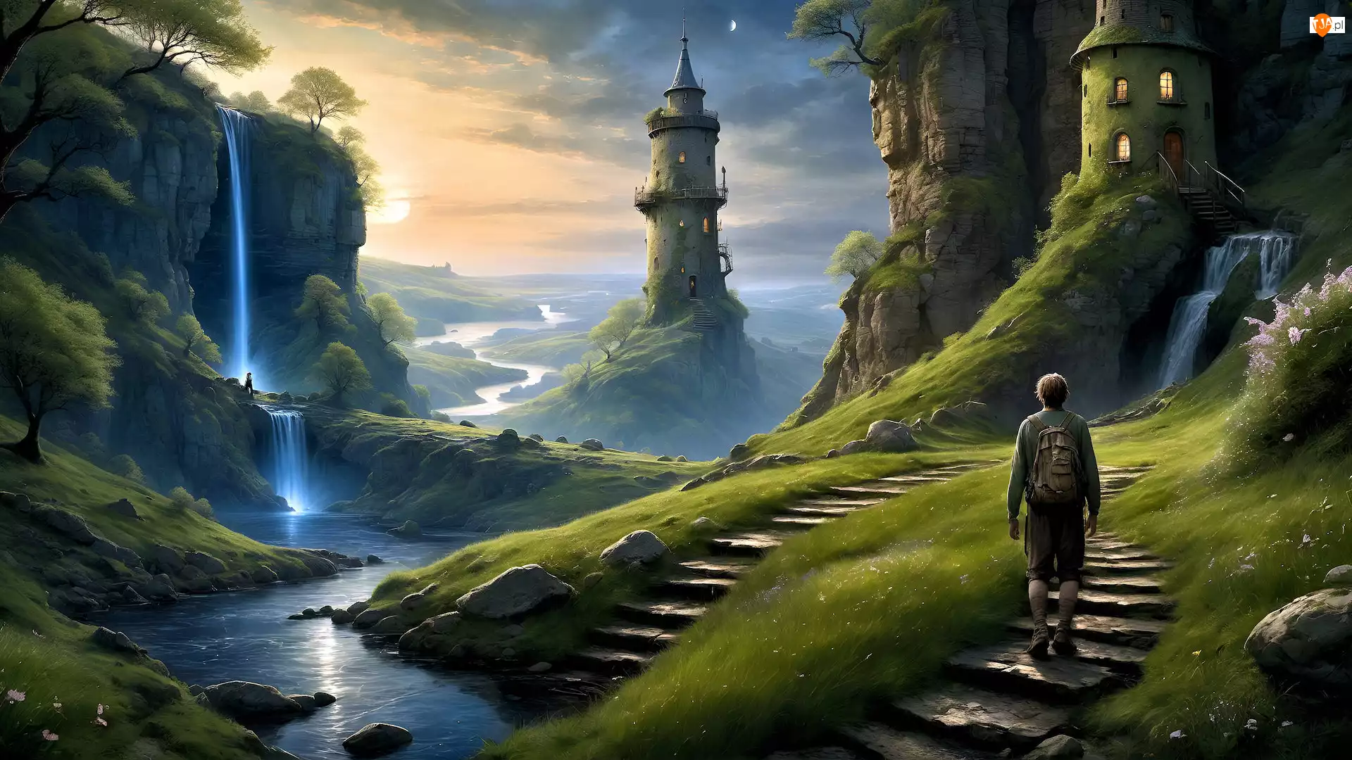 Schody, Grafika, Wieża, Wędrowiec, Góry, Wodospad, Fantasy, Rzeka