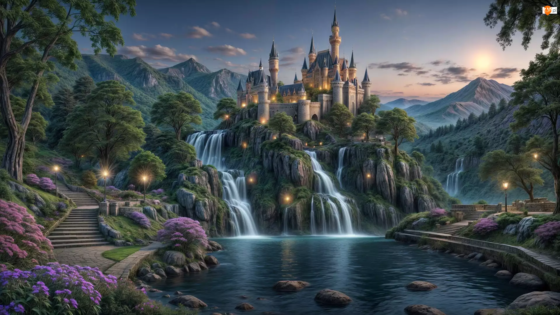 Drzewo, Zamek, Schod, Góra, Wodospad, Kwiat, Grafika, Skała