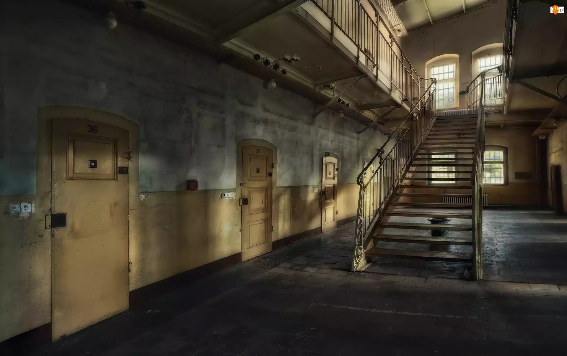 Więzienie, Schody, Korytarz, Zaniedbany, Drzwi
