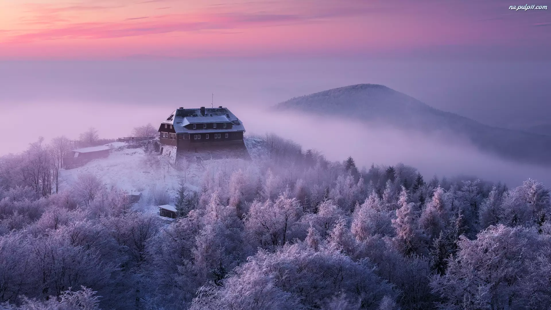 Czechy, Zima, Góry Łużyckie, Lasy, Schronisko turystyczne, Szron, Mgła, Wschód słońca, Drzewa