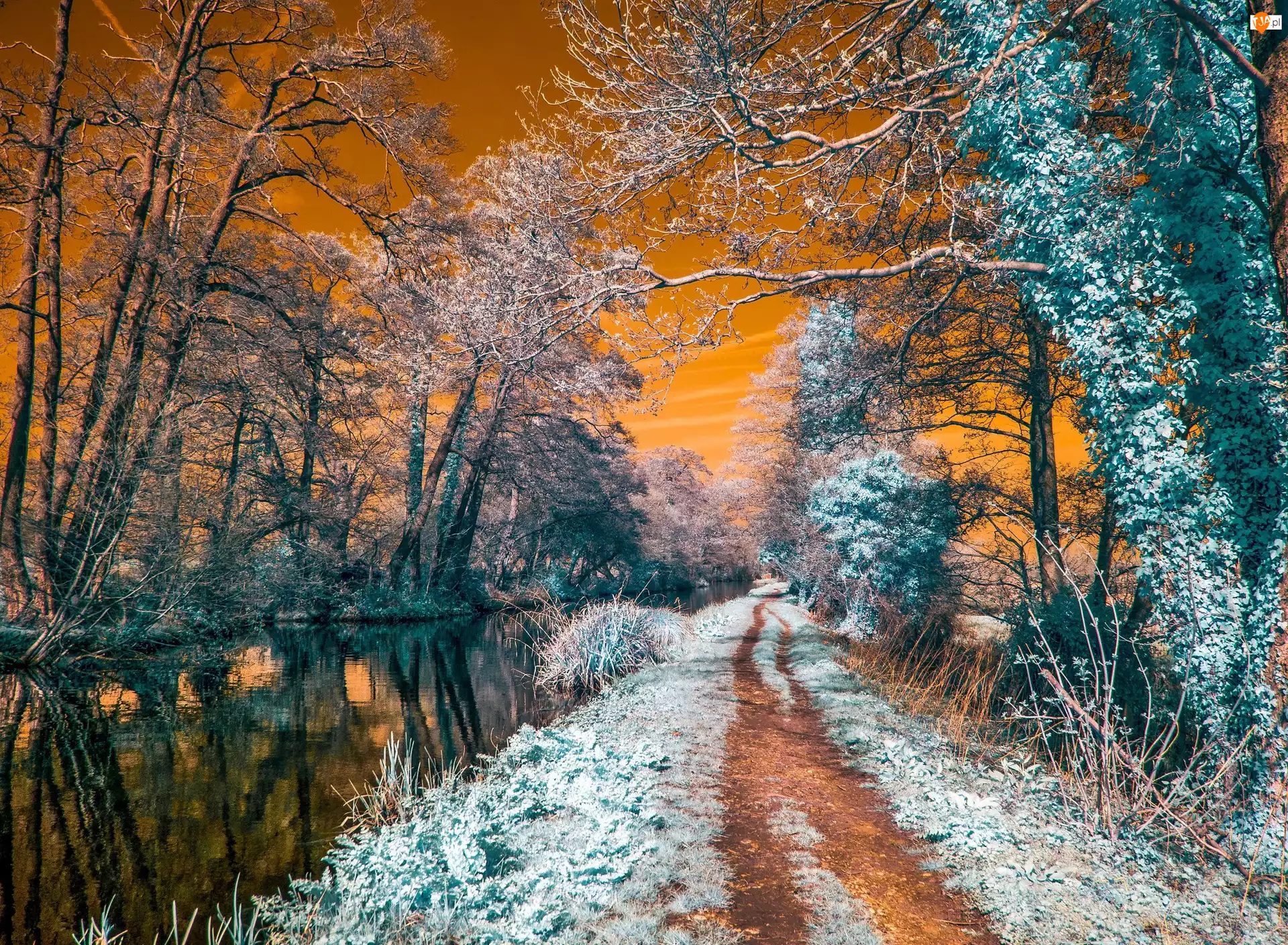 Ścieżka, Słońca, Rzeka, Zima, Drzewa, Zachód