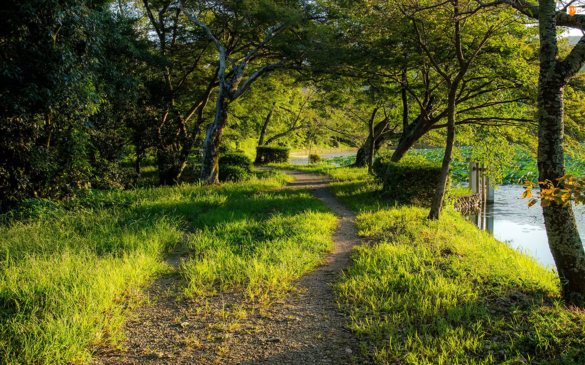 Ścieżka, Staw, Drzewa, Park, Trawa