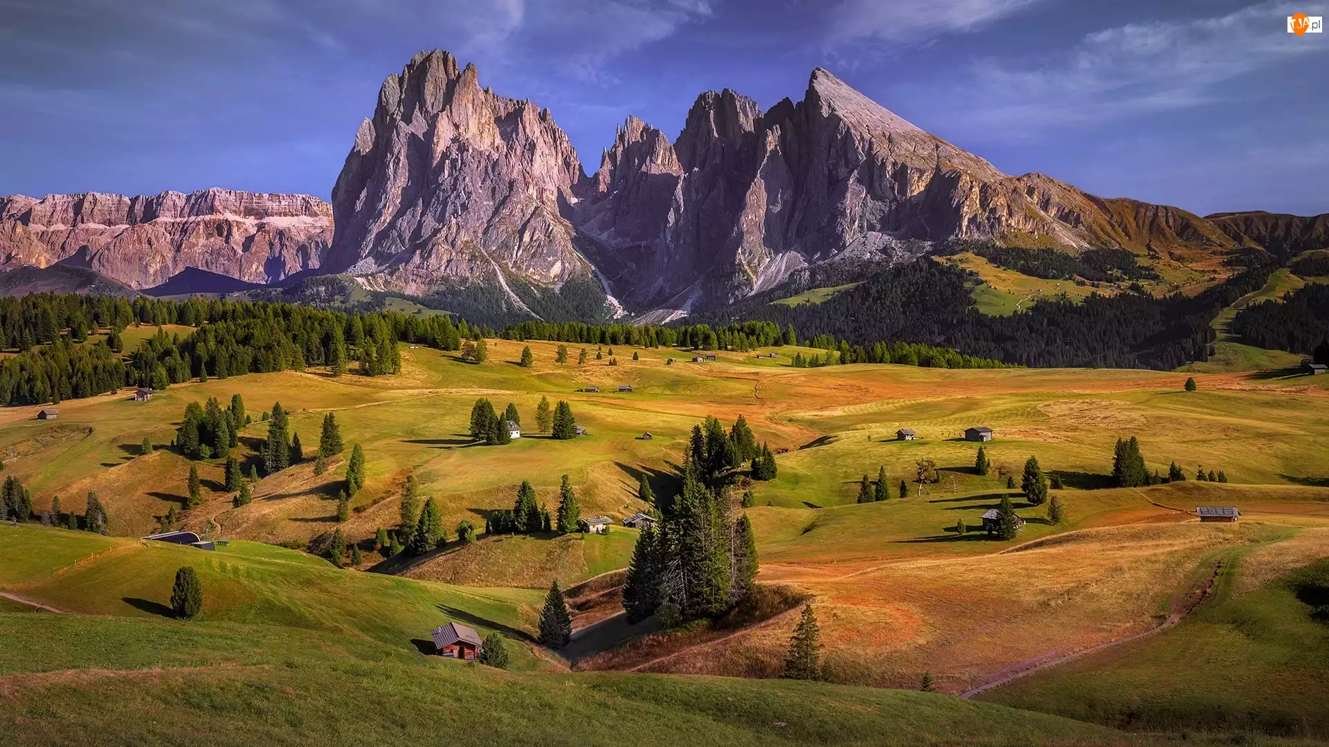 Seiser Alm, Góry, Płaskowyż, Włochy, Dolina, Dolomity, Drewniane, Chmury, Sassolungo, Domy, Drzewa, Val Gardena