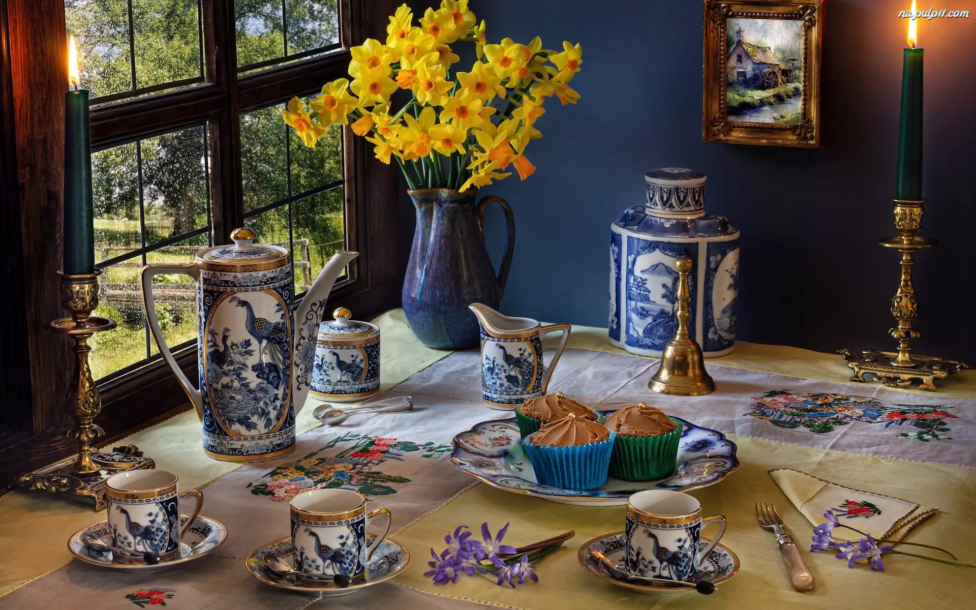 Babeczki, Okno, Serwis kawowy, Świeca, Świecznik, Bukiet kwiatów, Narcyzy żonkile, Kompozycja, Obraz