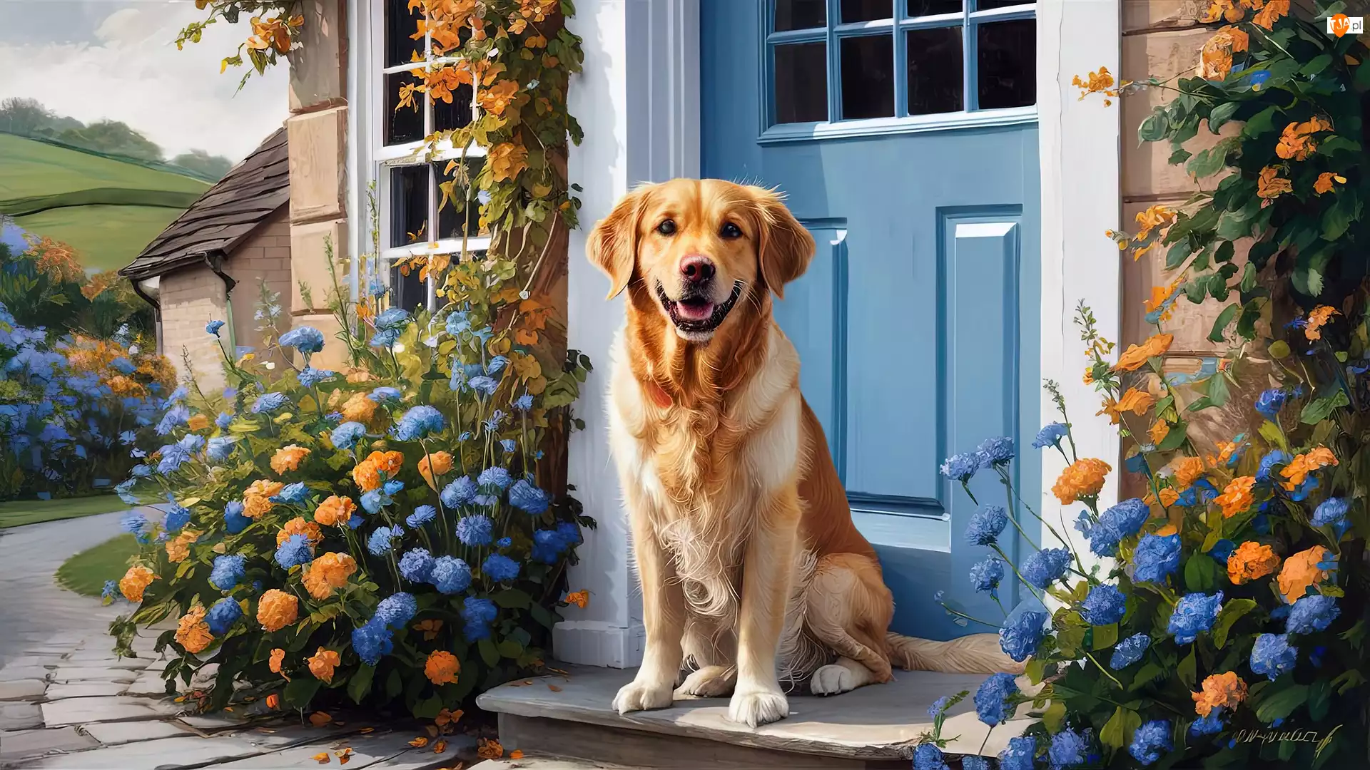 Golden retriever, Pies, Drzwi, Dom, Kwiaty, Niebieski