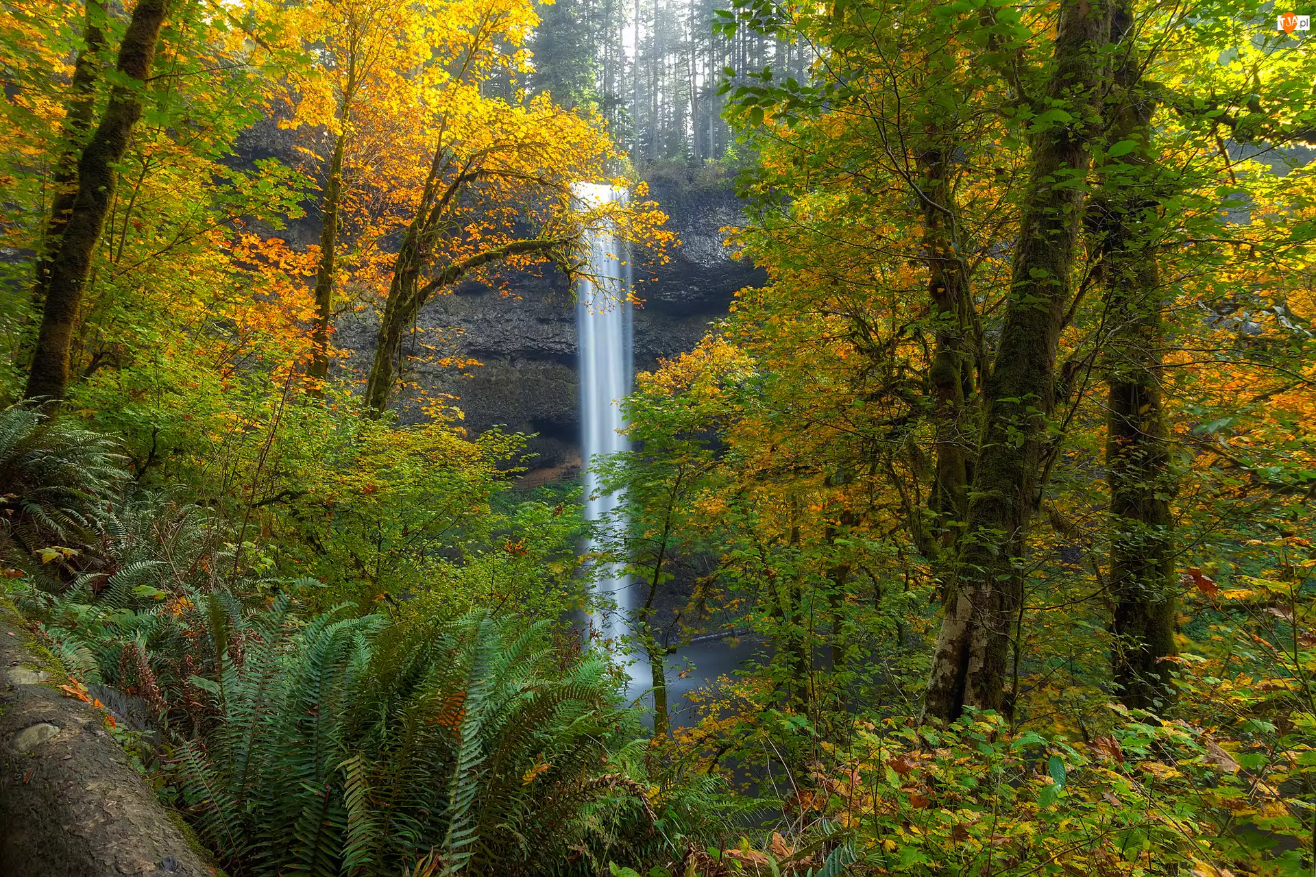 Park miejski Silver Falls, Wodospad South Falls, Paprocie, Oregon, Las, Jesień, Stany Zjednoczone, Drzewa