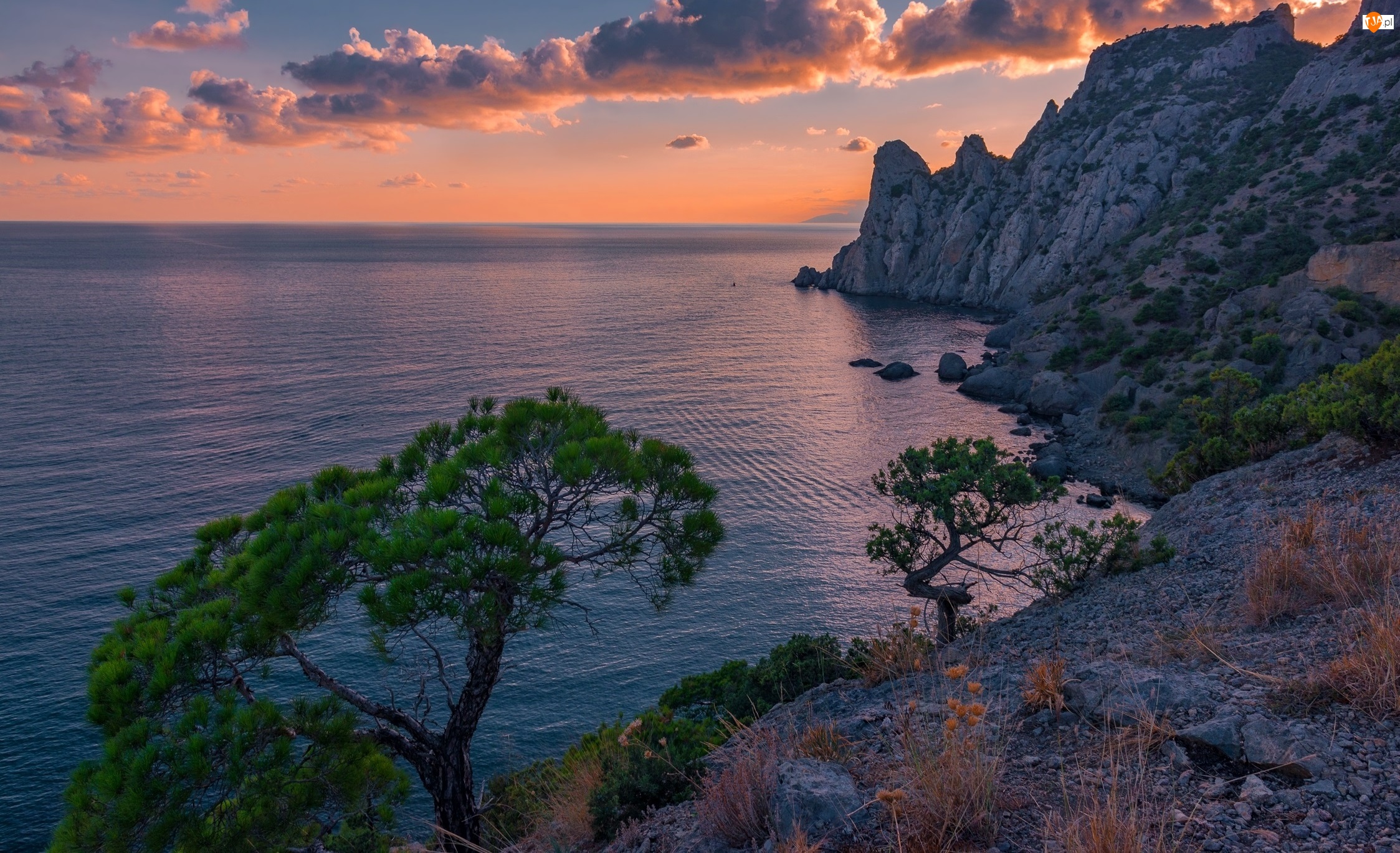 Zachód słońca, Chmurki, Rośliny, Morze, Drzewa, Skały, Brzeg