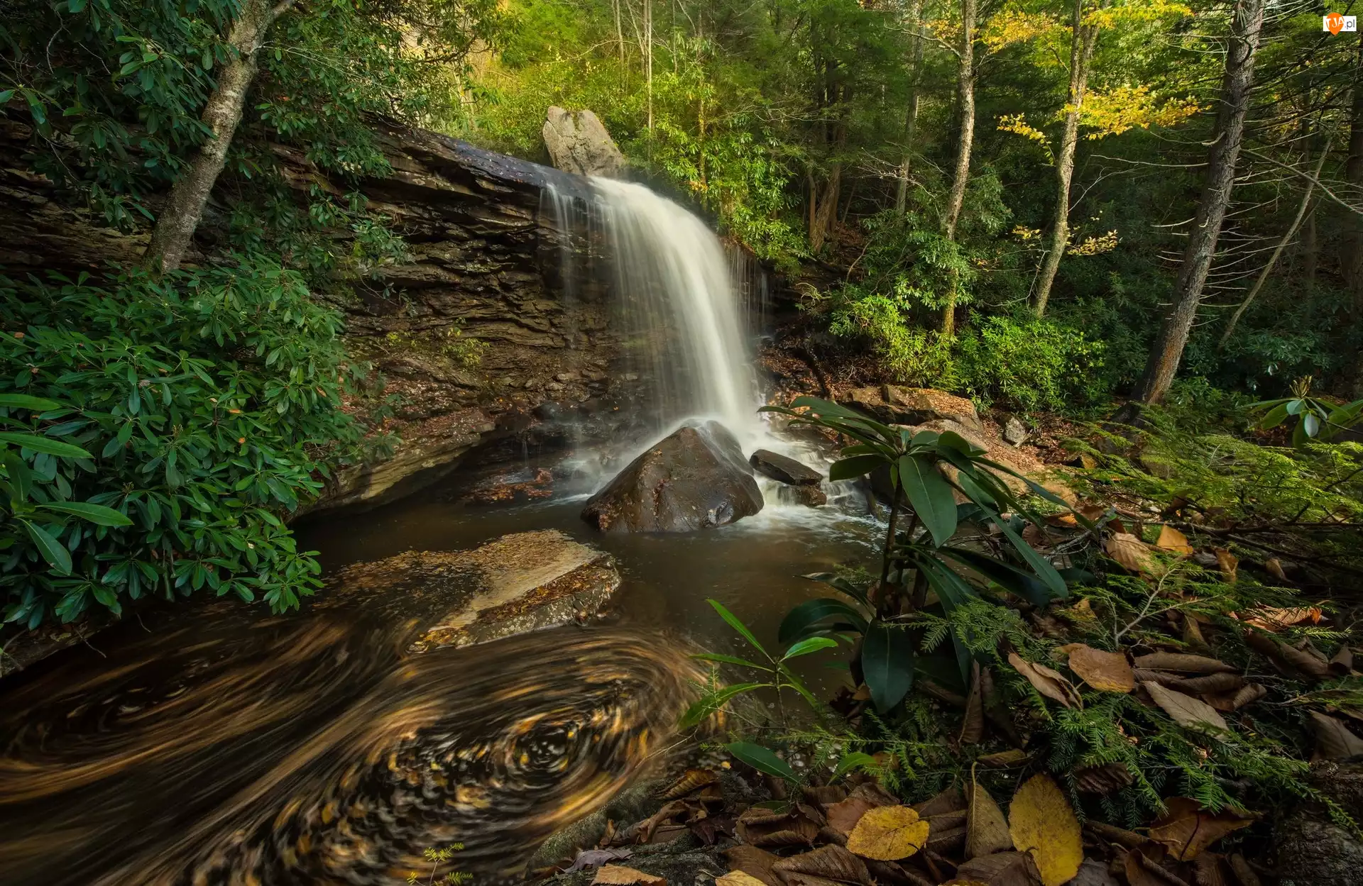 Las, Wodospad, Kamienie, Liście, Drzewa, Skały