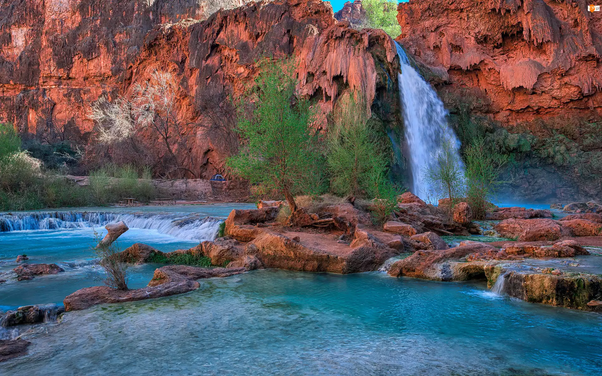 Kanion, Wodospad Havasu Falls, Arizona, Drzewa, Rzeka Havasu Creek, Stany Zjednoczone, Skały, Park Narodowy Wielkiego Kanionu