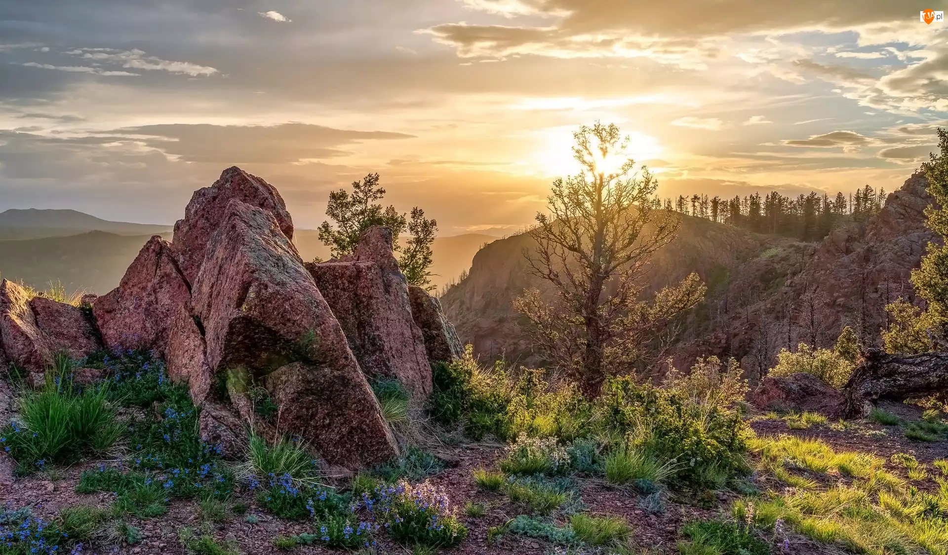 Skały, Drzewa, Promienie słońca, Góry, Trawy, Kępy, Kwiaty