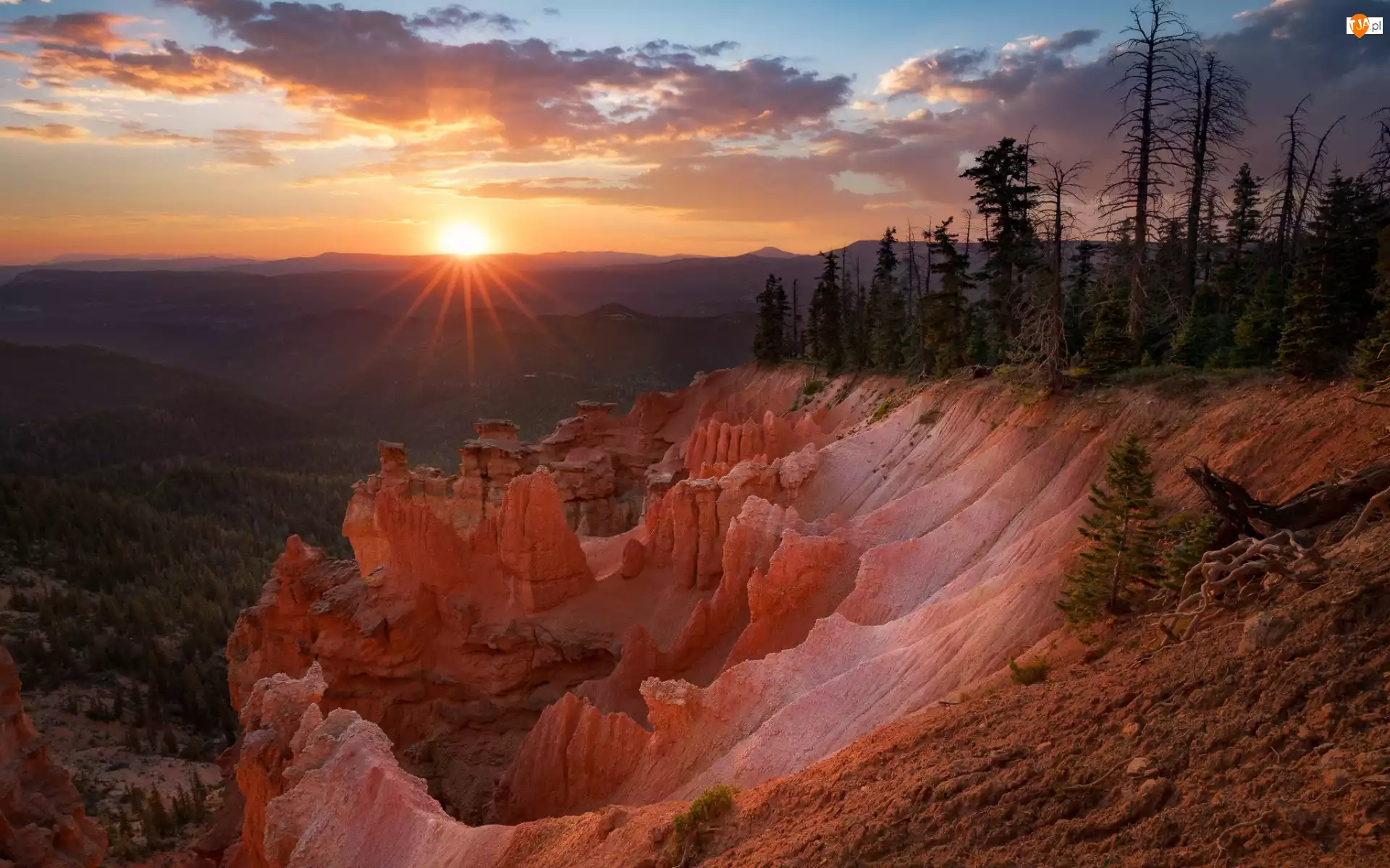 Skały, Drzewa, Stany zjednoczone, Zachód słońca, Utah, Park Narodowy Bryce Canyon, Promienie słońca