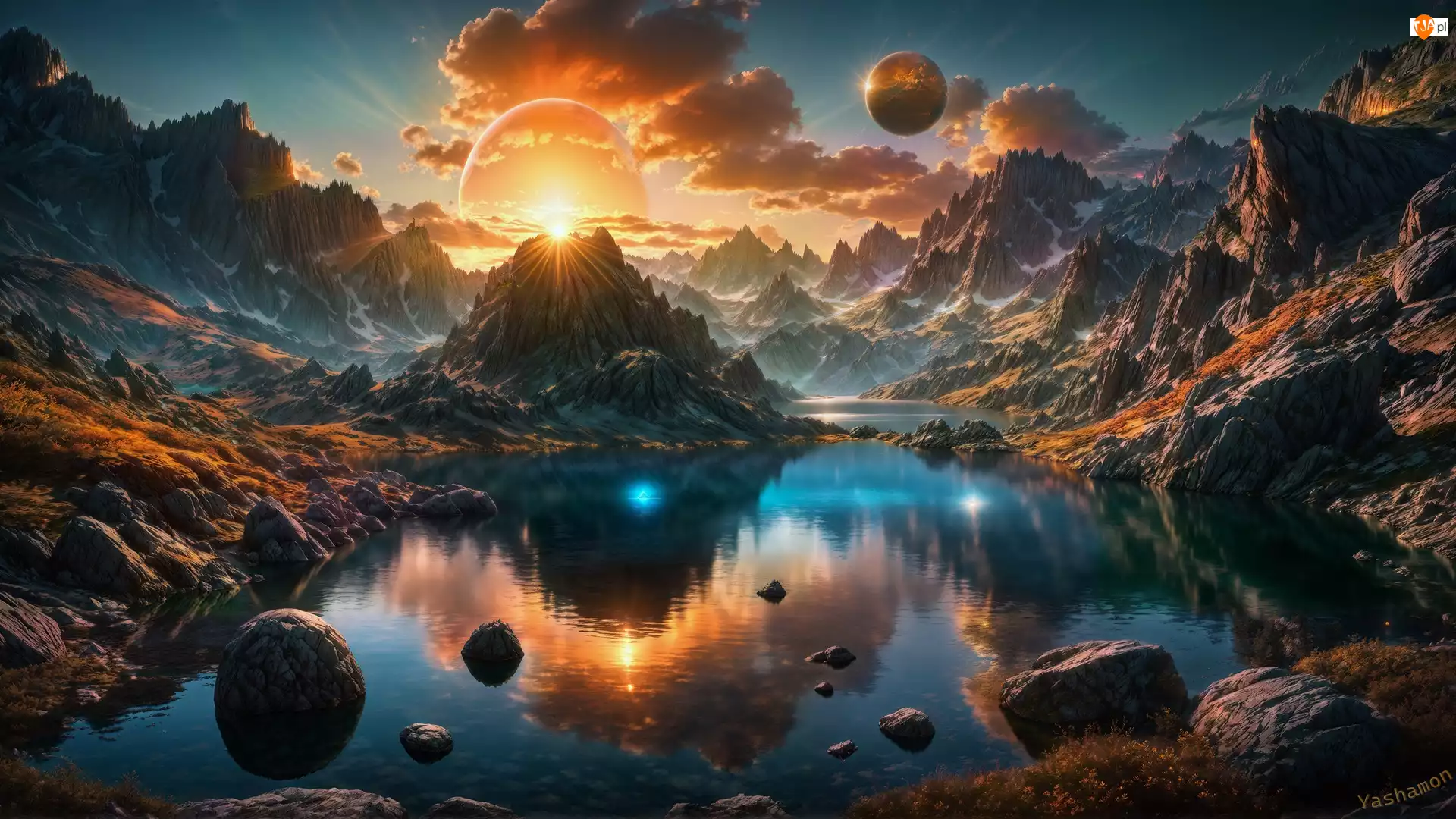 Skały, Góry, Chmury, Grafika, Jezioro, Odbicie