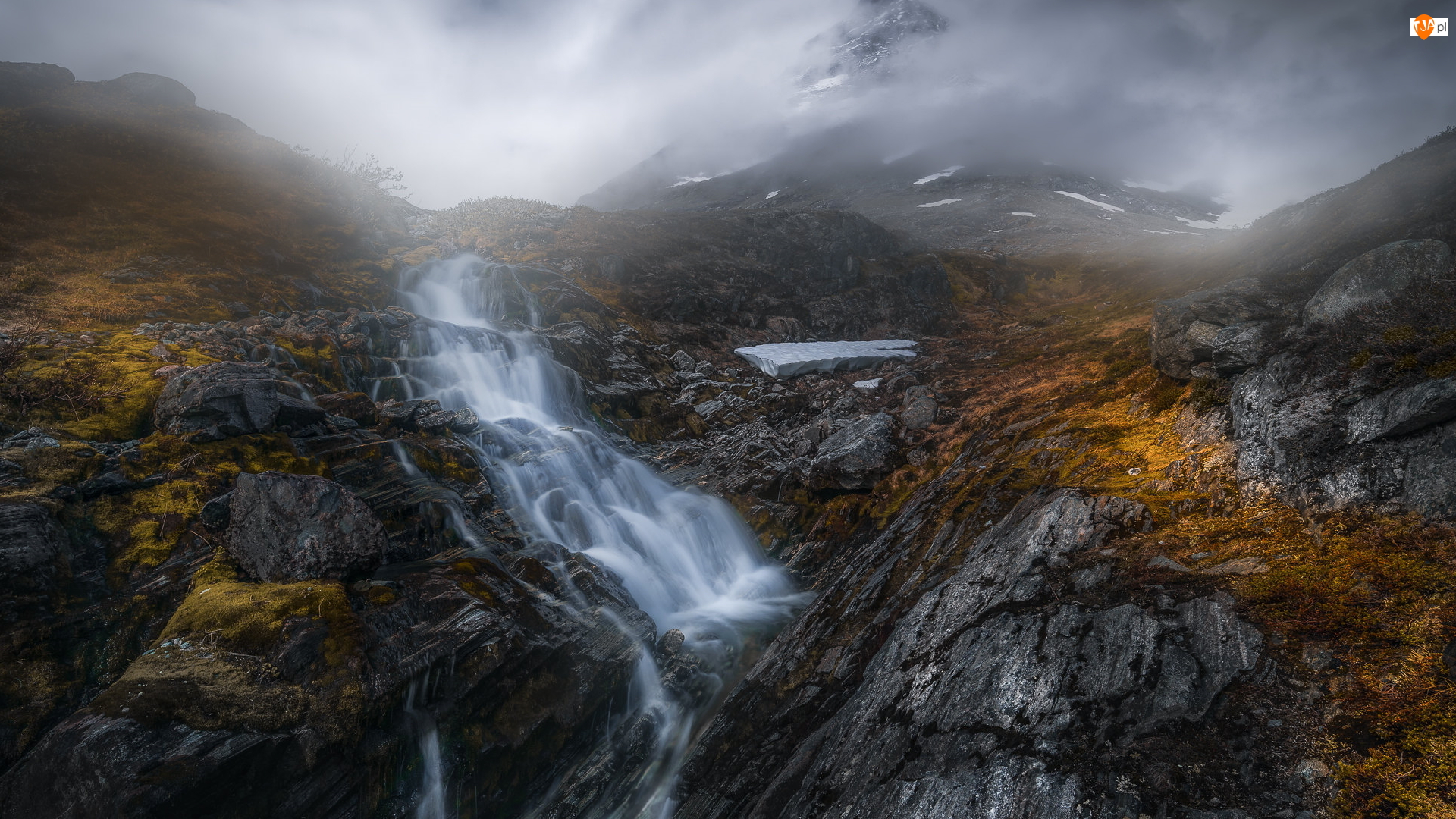 Skały, Góry, Mgła, Norwegia, Rzeka, Romsdalen