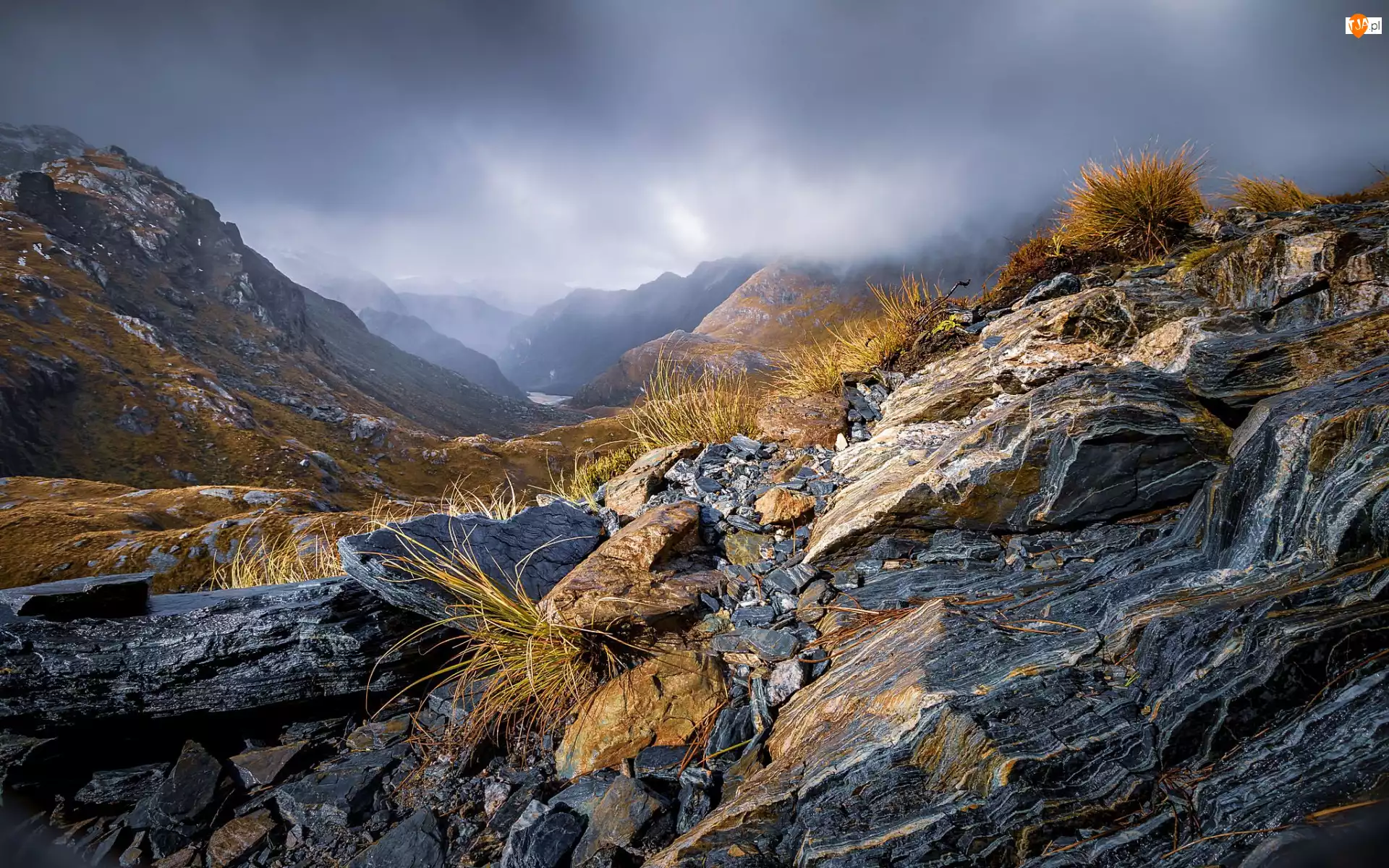 Skały, Kamienie, Chmury, Góry, Trawa, Sucha, Mg�