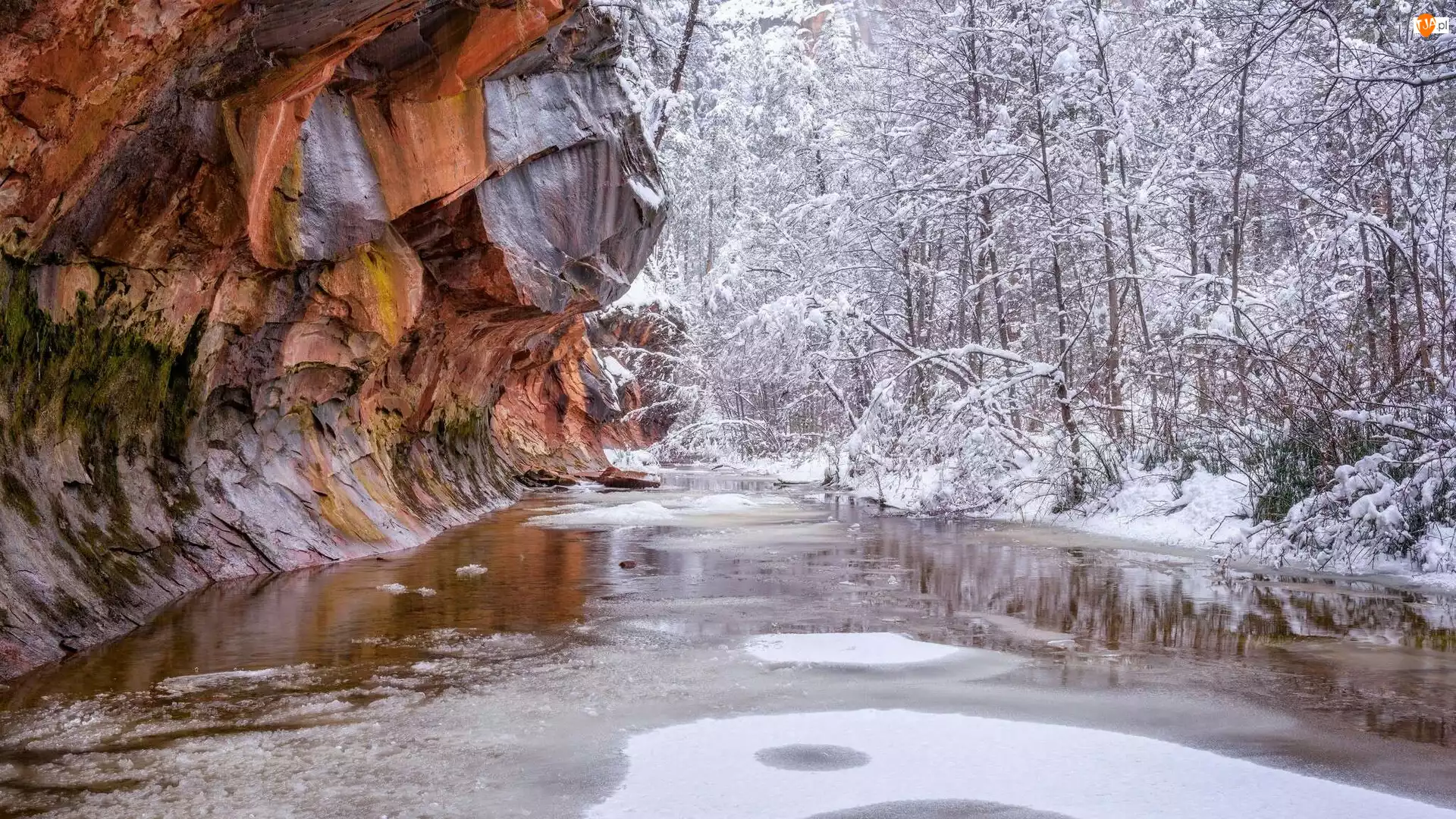 Ośnieżone, Szlak West Fork Oak Creek Trail, Drzewa, Arizona, Rzeka Oak Creek, Stany Zjednoczone, Skały, Sedona, Zima