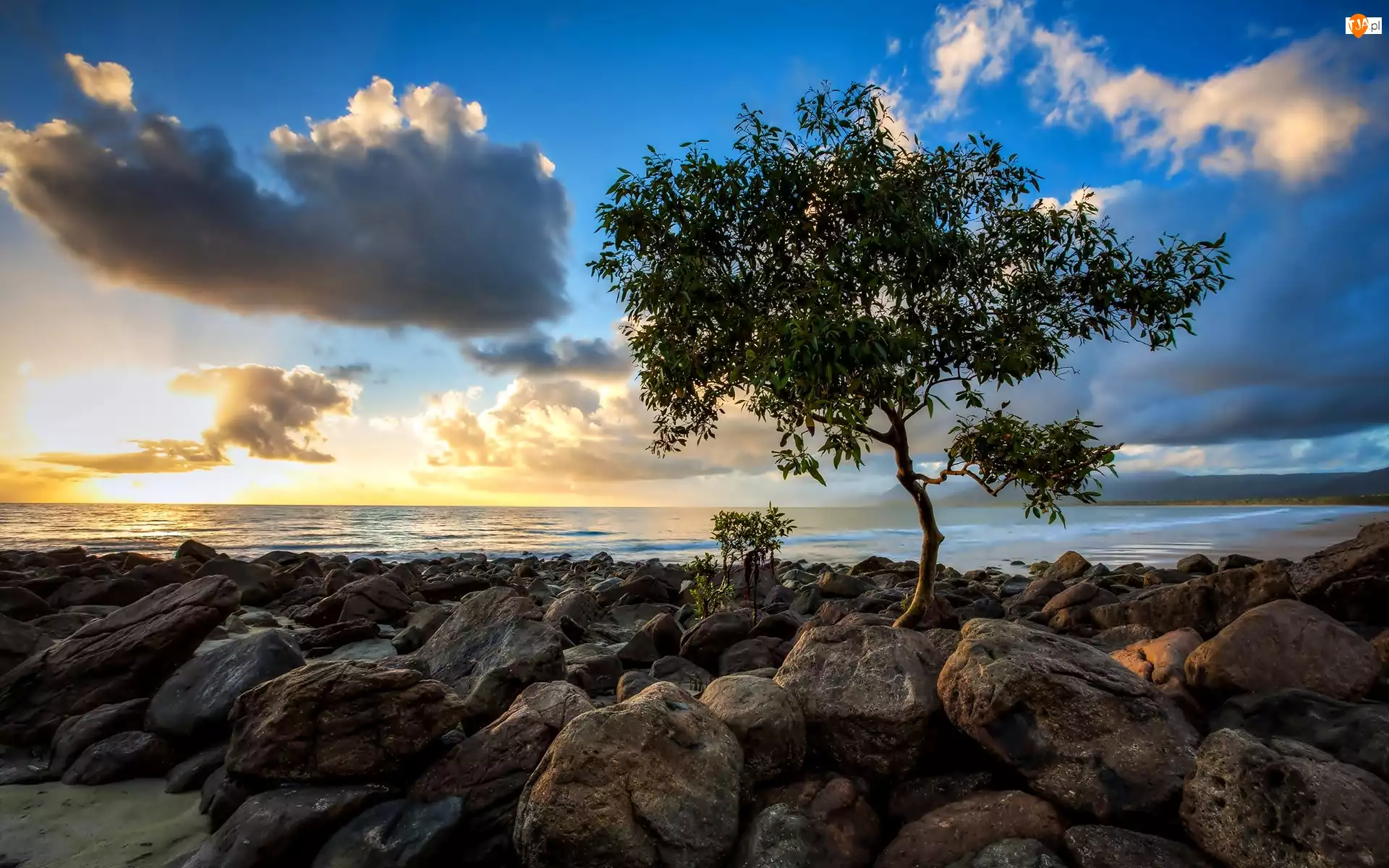 Skały, Obłoki, Wschód Słońca, Morze, Wybrzeże, Drzewo