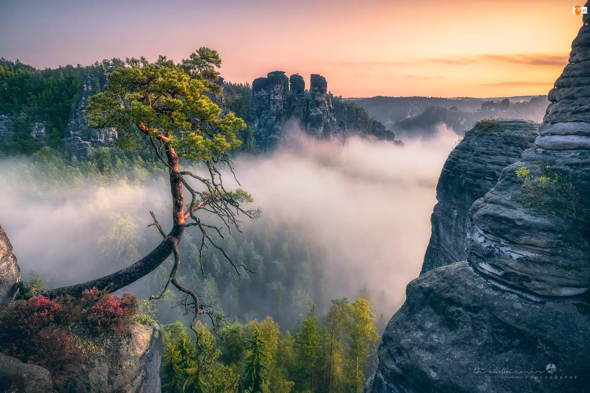 Wschód słońca, Park Narodowy Saskiej Szwajcarii, Góry Połabskie, Sosna, Skały, Lasy, Niemcy, Formacja Bastei