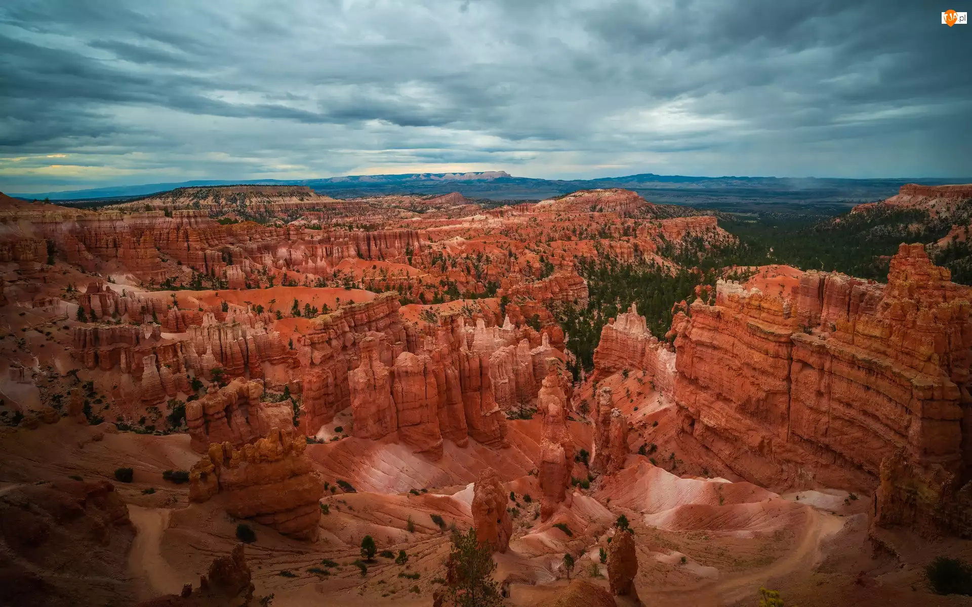 Skały, Rośliny, Stany Zjednoczone, Kanion, Stan Utah, Park Narodowy Bryce Canyon, Chmury