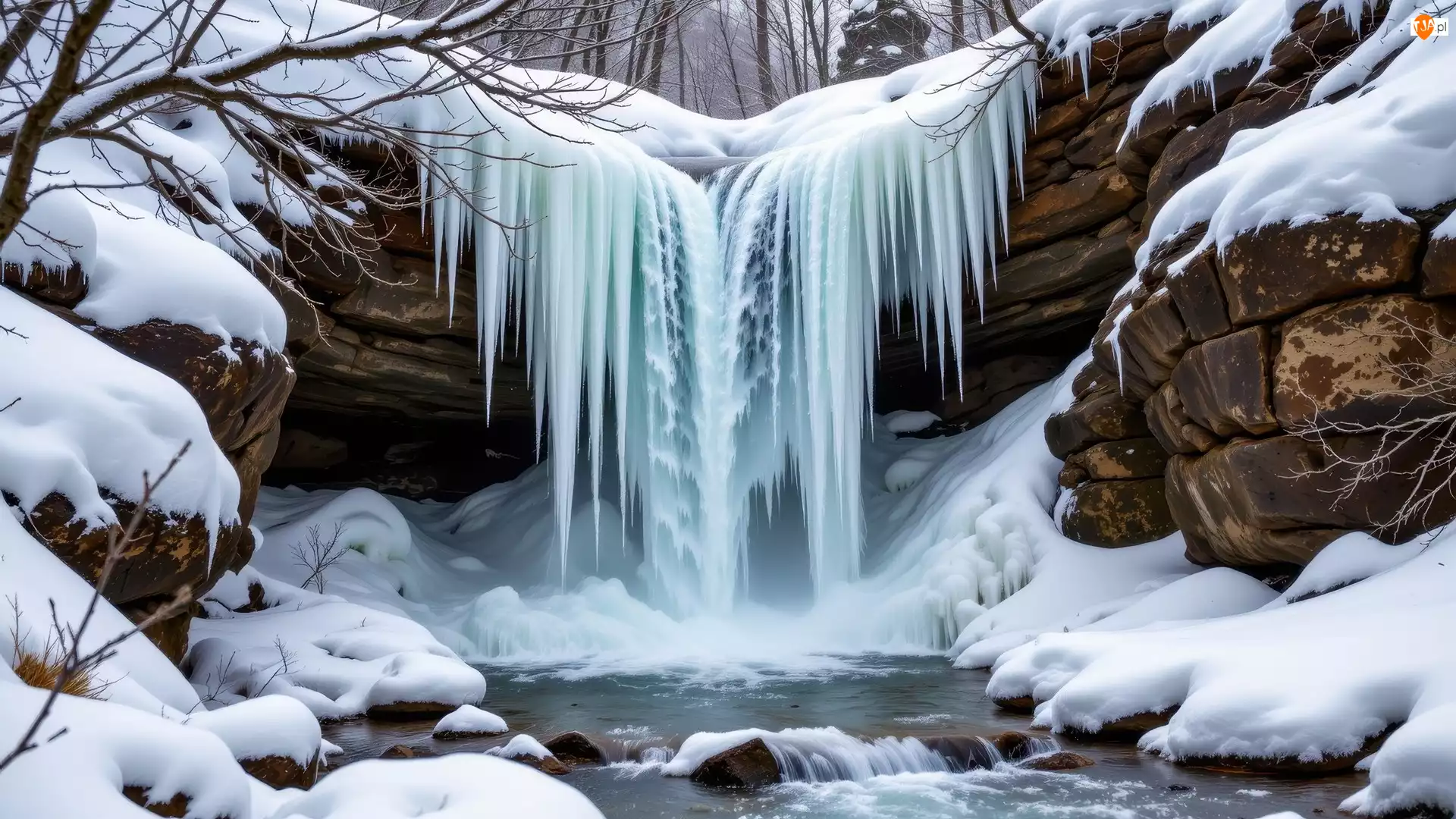 Skały, Wodospad, Drzewa, Zima, Rzeka, Lodu, Sople