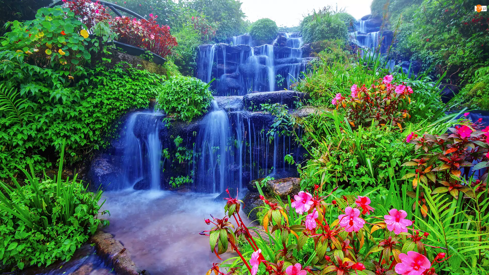 Skały, Wodospad, Kwiaty, Drzewa, Kaskada, Roślin