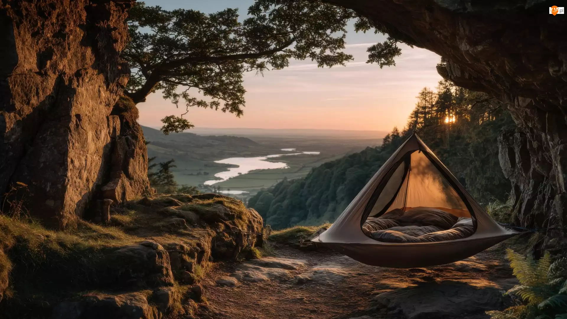 Skały, Wschód słońca, Hamak, Grafika AI, Drzewa, Rzeka