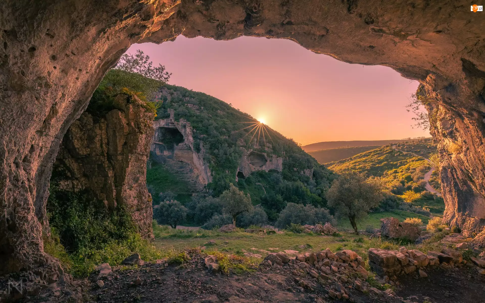 Skały, Zachód słońca, Buracas do Casmilo, Portugalia, Jaskinia