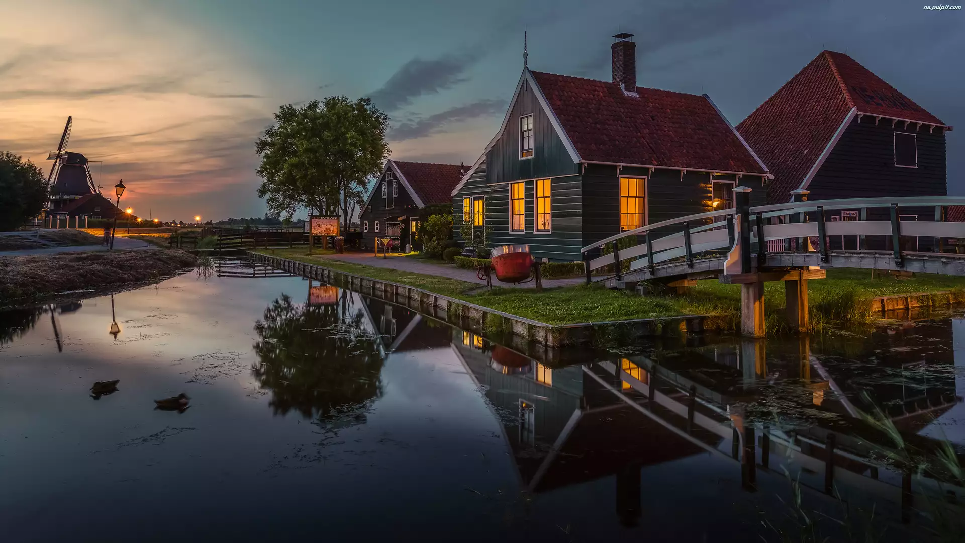 Rzeka, Domy, Skansen Zaanse Schans, Holandia, Kaczki, Wiatrak, Most
