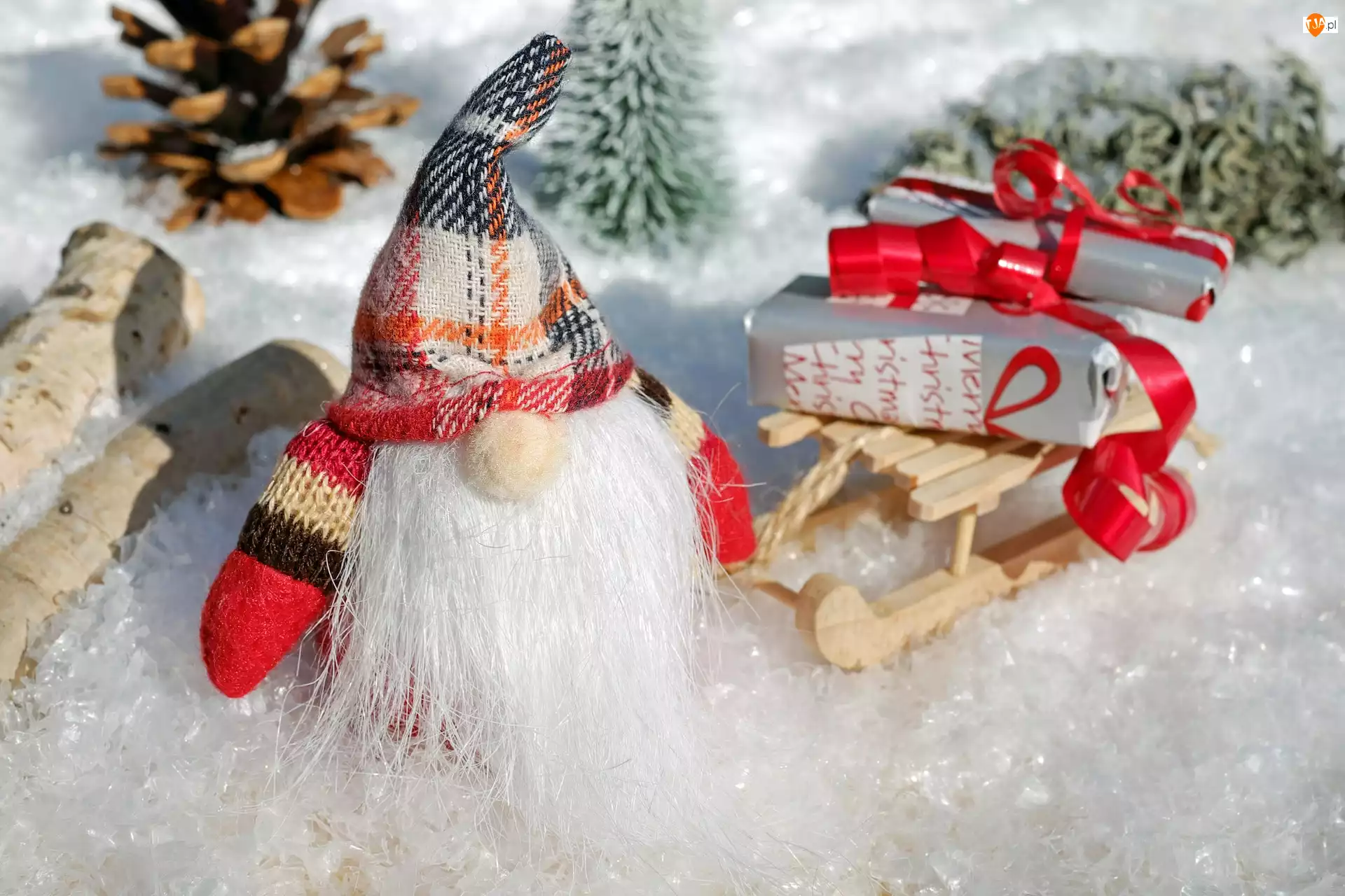 Dekoracja, Świąteczna, Skrzat, Prezenty, Śnieg, Sanki