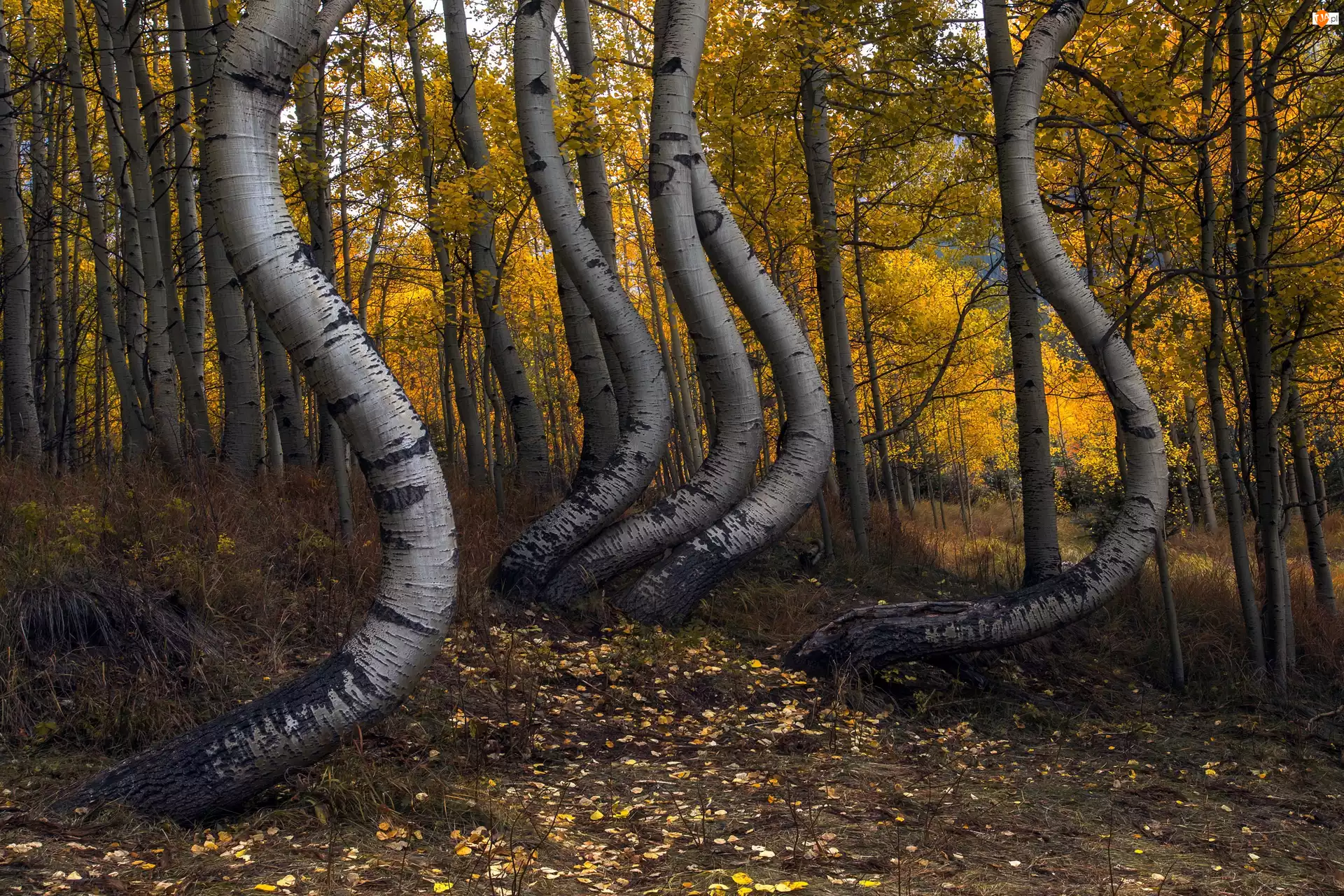 Krzywe, Jesień, Drzewa, Las, Brzozy