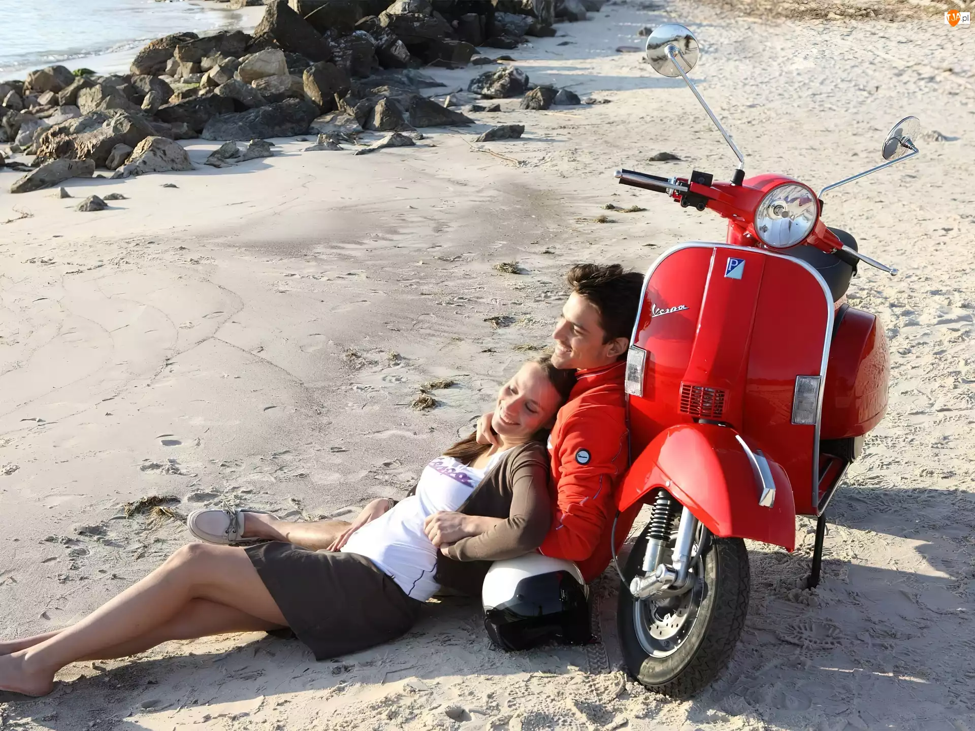 Czerwony, Para, Plaża, Morze, Skuter, Kamienie