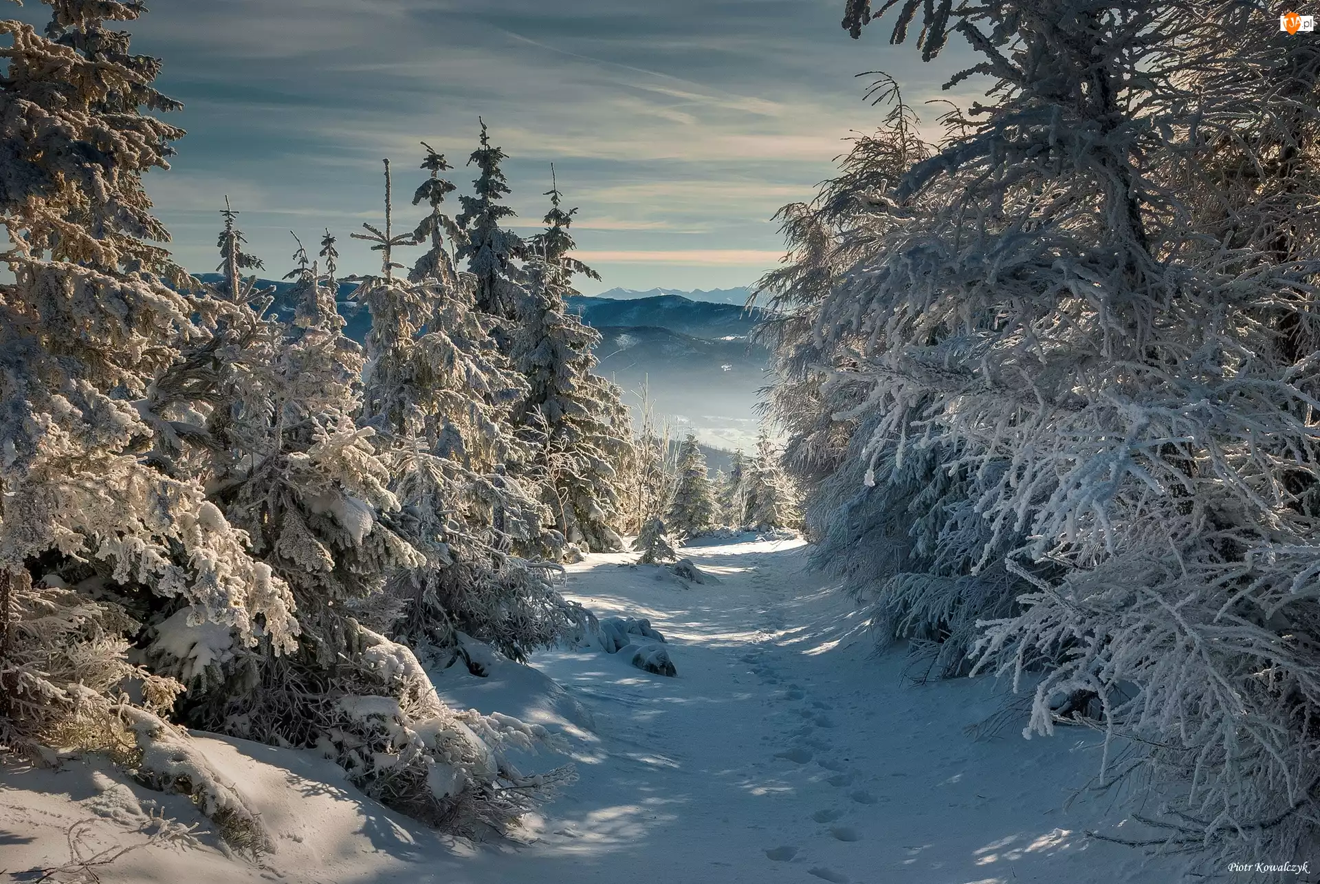 Las, Śnieg, Chmury, Zima, Ślady, Góry, Drzewa