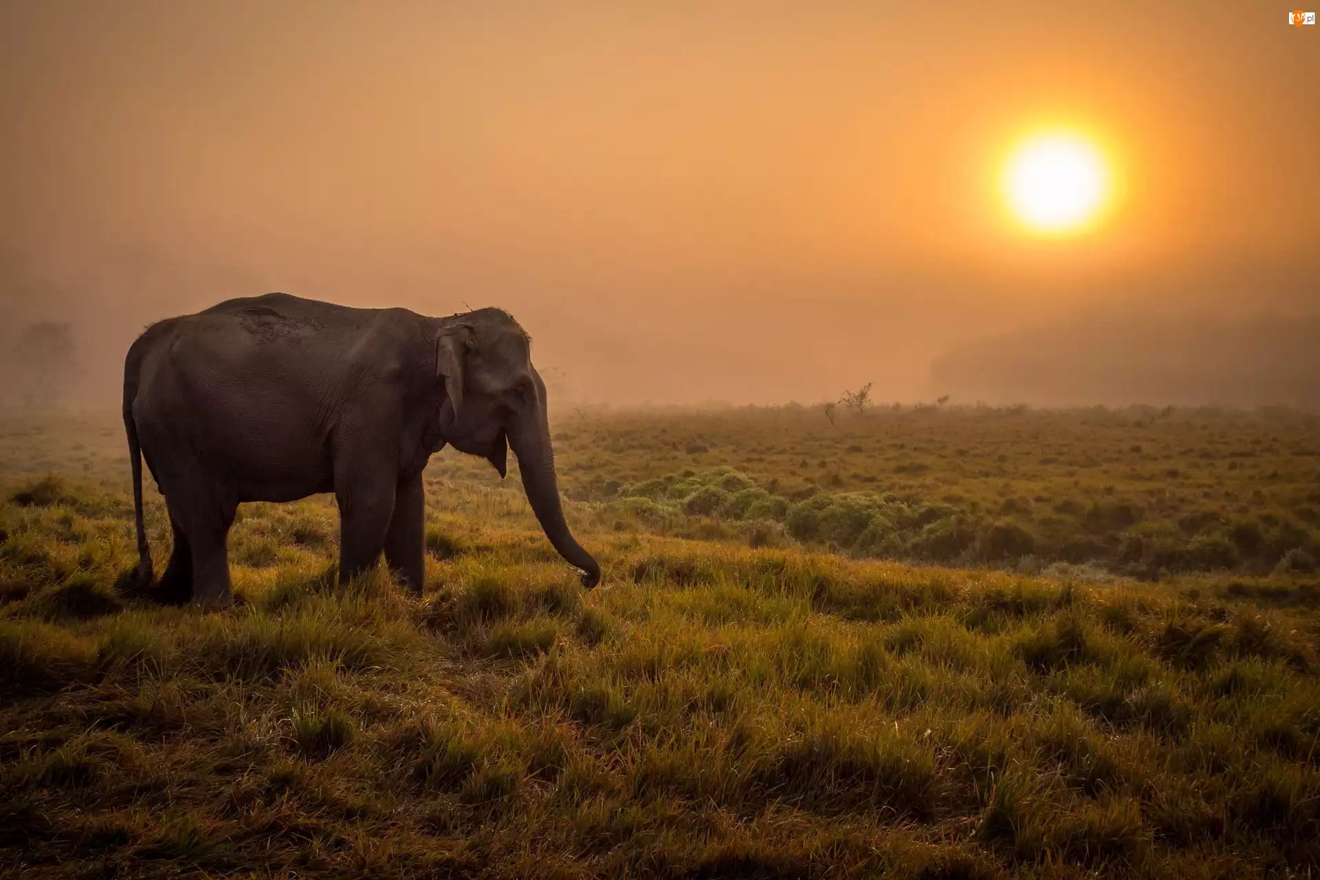 Słoń na spacerze po sawannie w blasku słońca