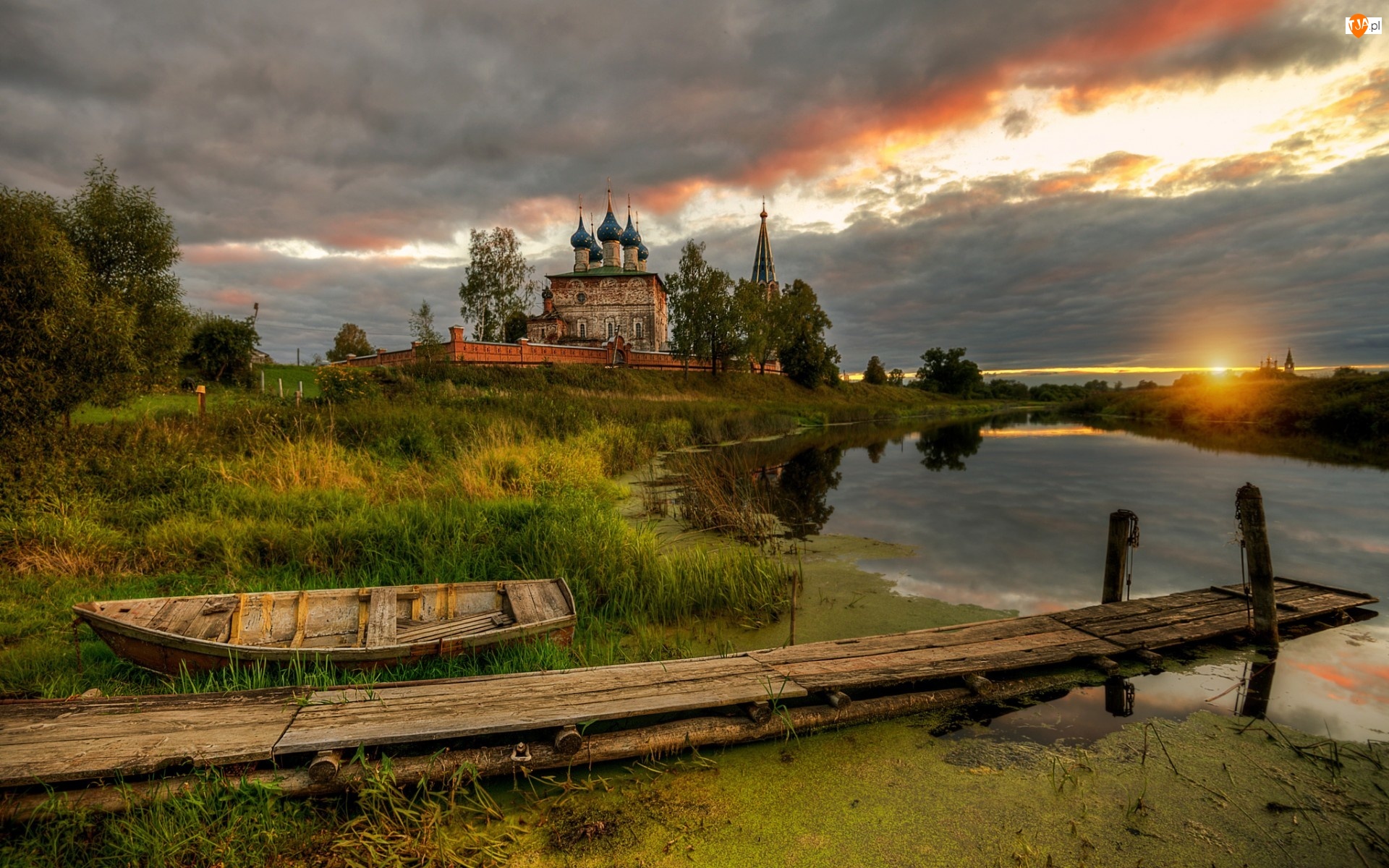 Słońca, Cerkiew, Dunilovo, Pomost, Rosja, Łódka, Zachód, Rzeka