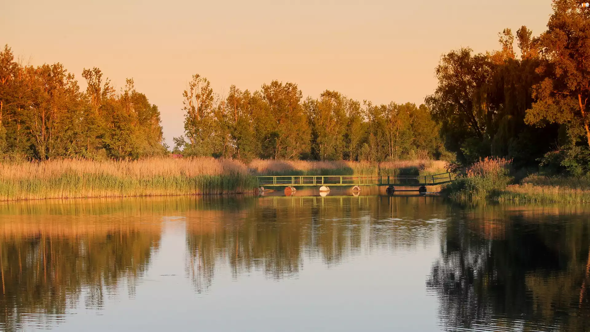 Słońca, Drzewa, Odbicie, Jezioro, Jesień, Trzciny, Zachód