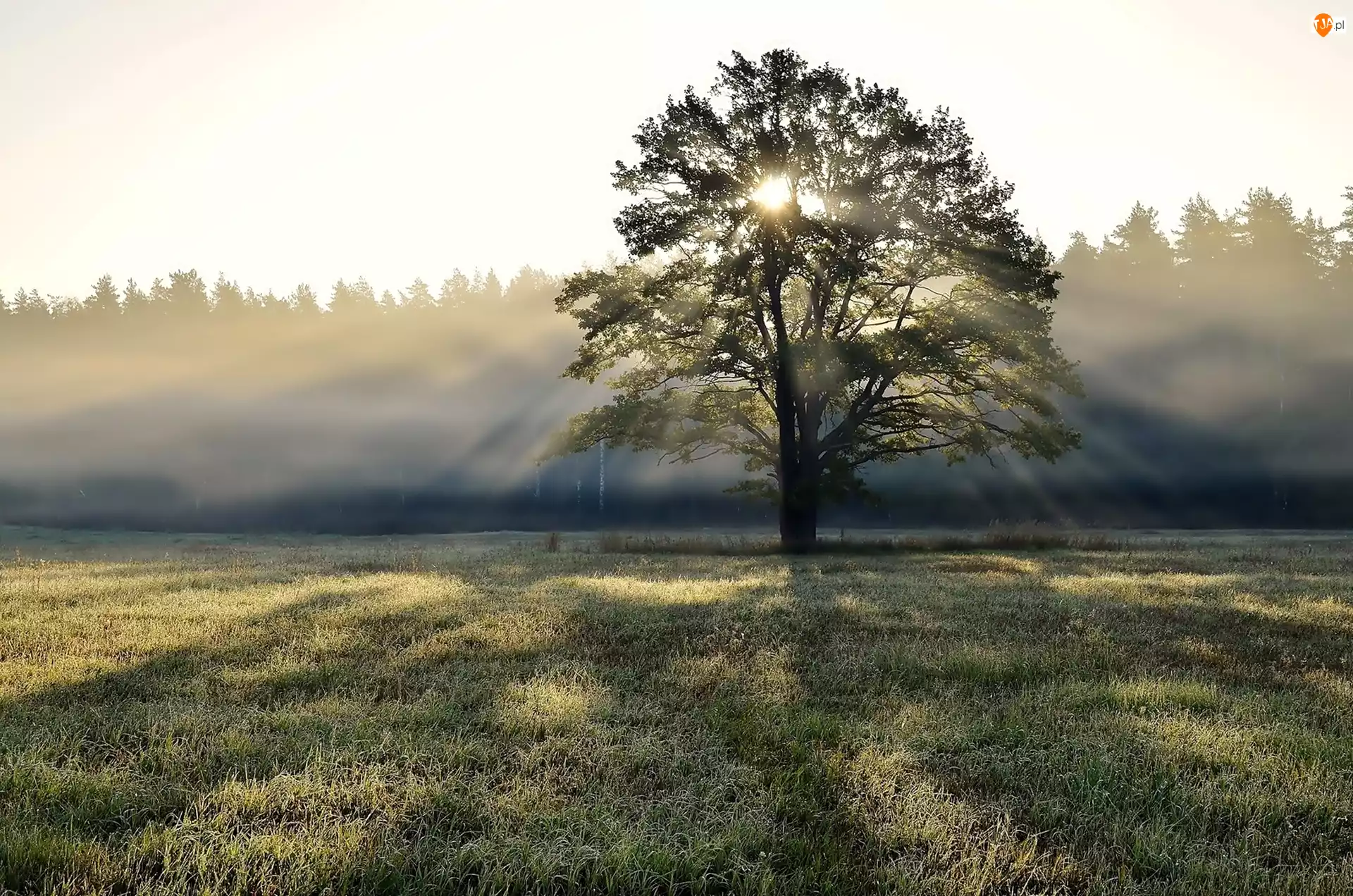 Słońca, Drzewo, Mgła, Łąka, Promienie