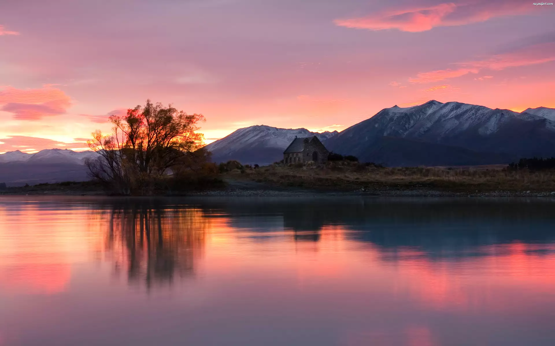 Słońca, Góry, Jezioro, Odbicie, Zachód, Drzewo