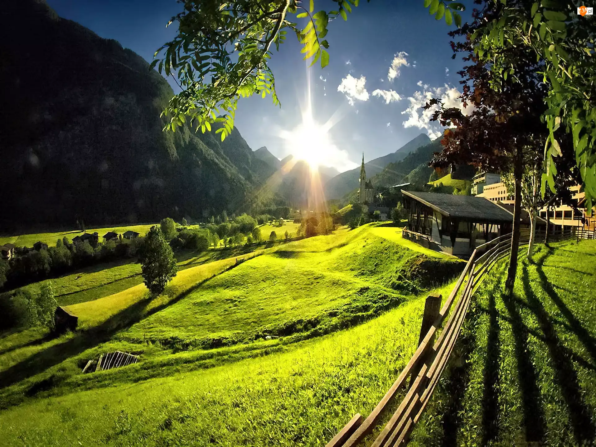 Słońca, Góry, Miasteczko, Dolina, Promienie