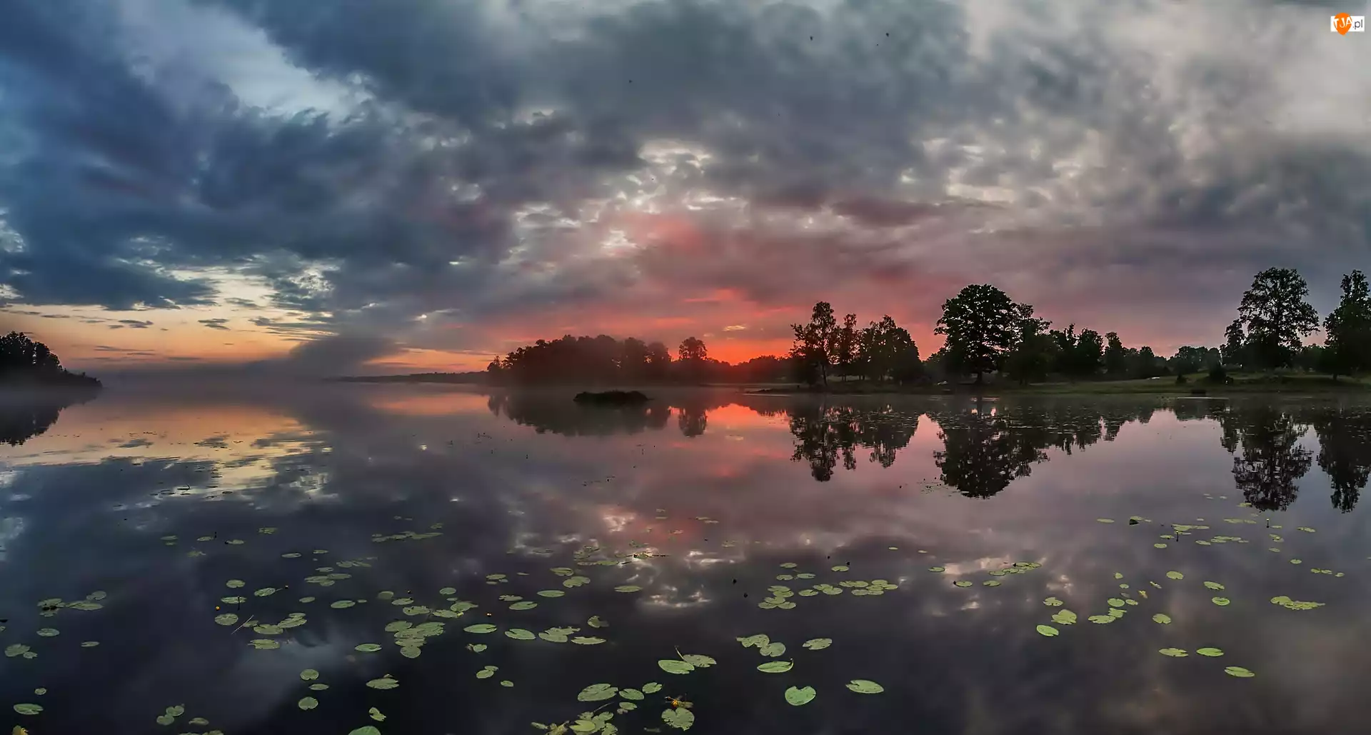 Słońca, Jezioro, Chmury, Drzewa, Zachód