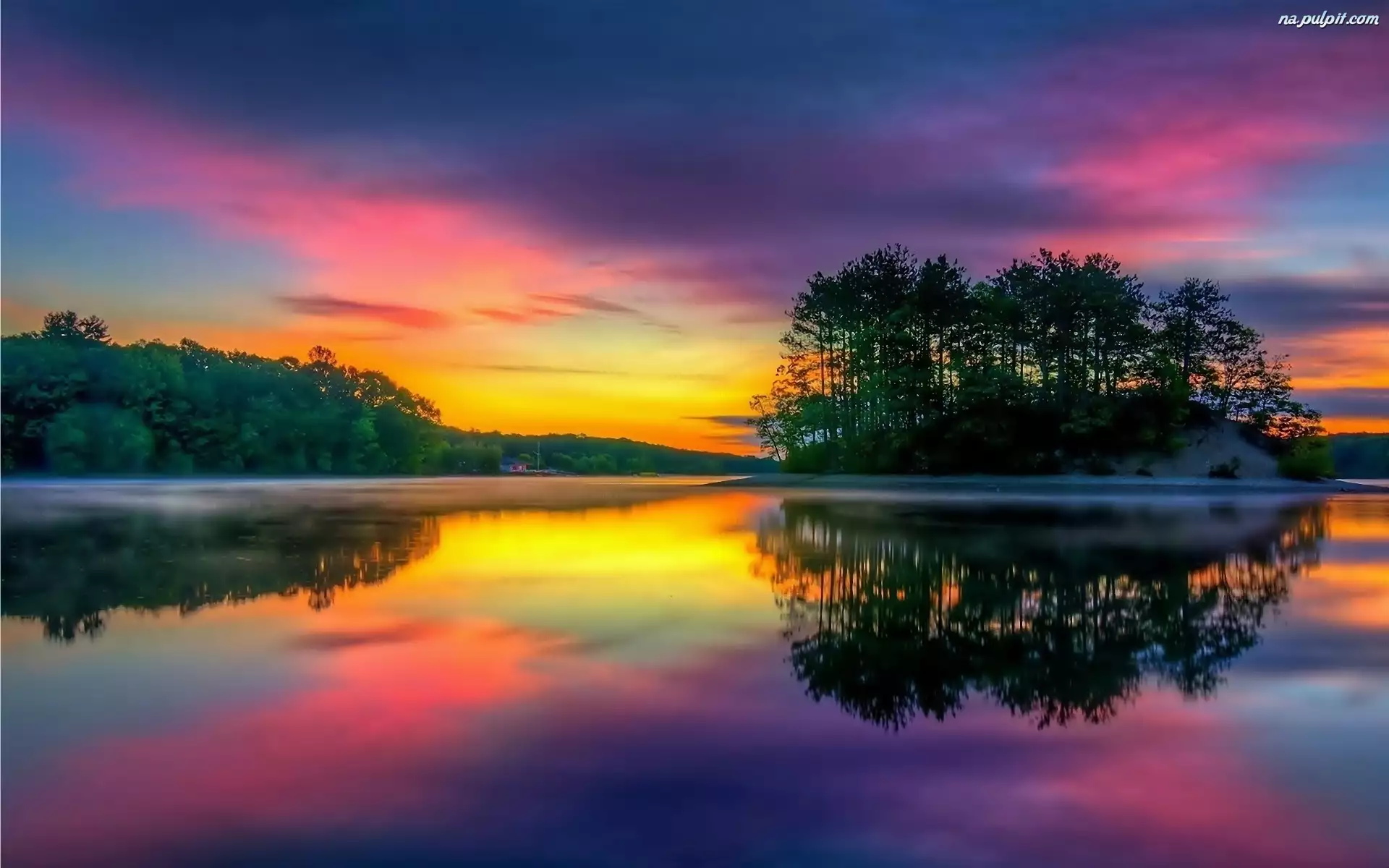 Słońca, Jezioro, Drzewa, Wyspa, Zachód