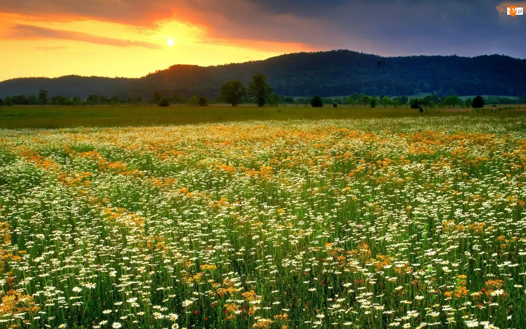 Słońca, Łąka, Góry, Kwiaty, Zachód